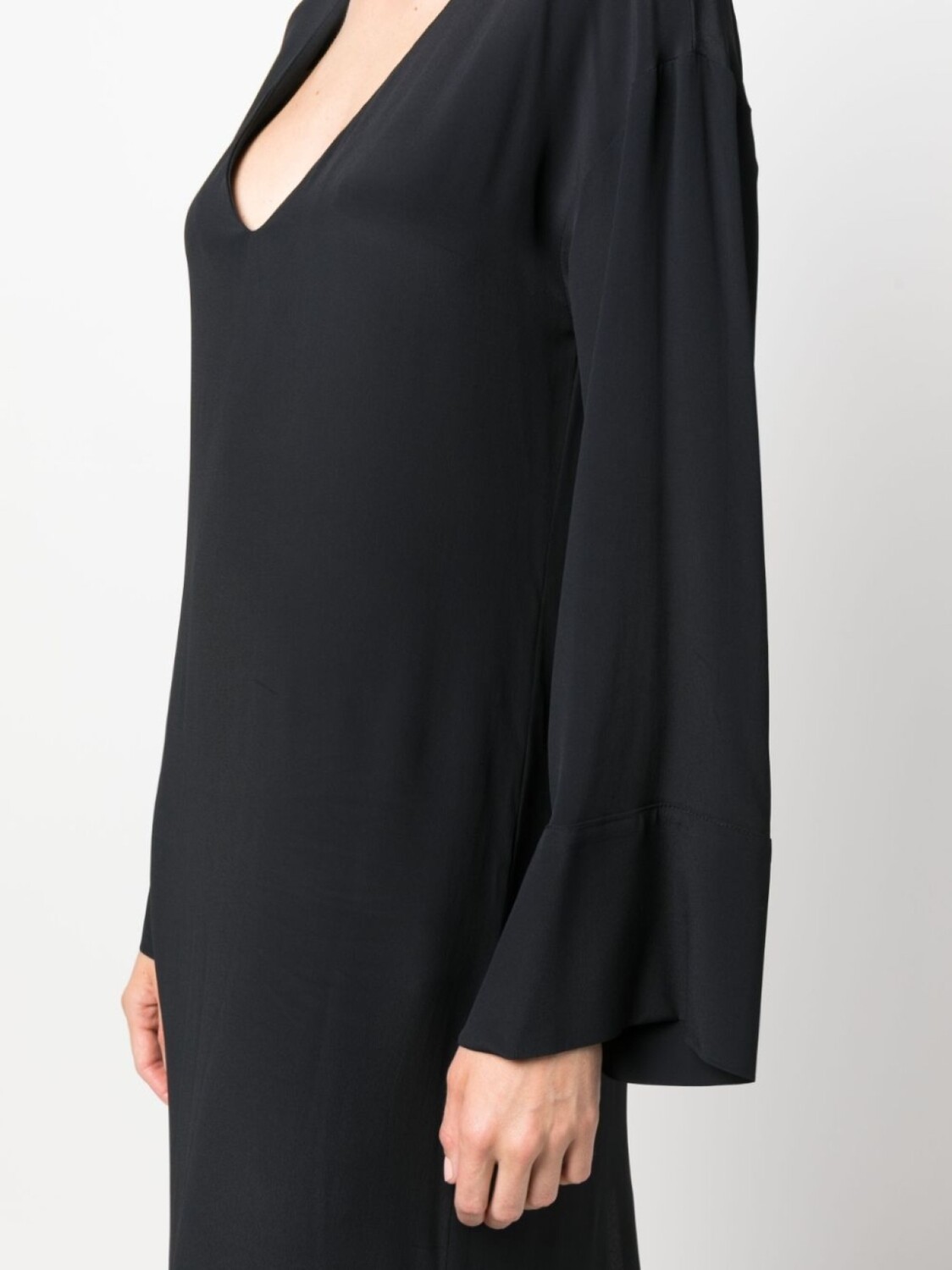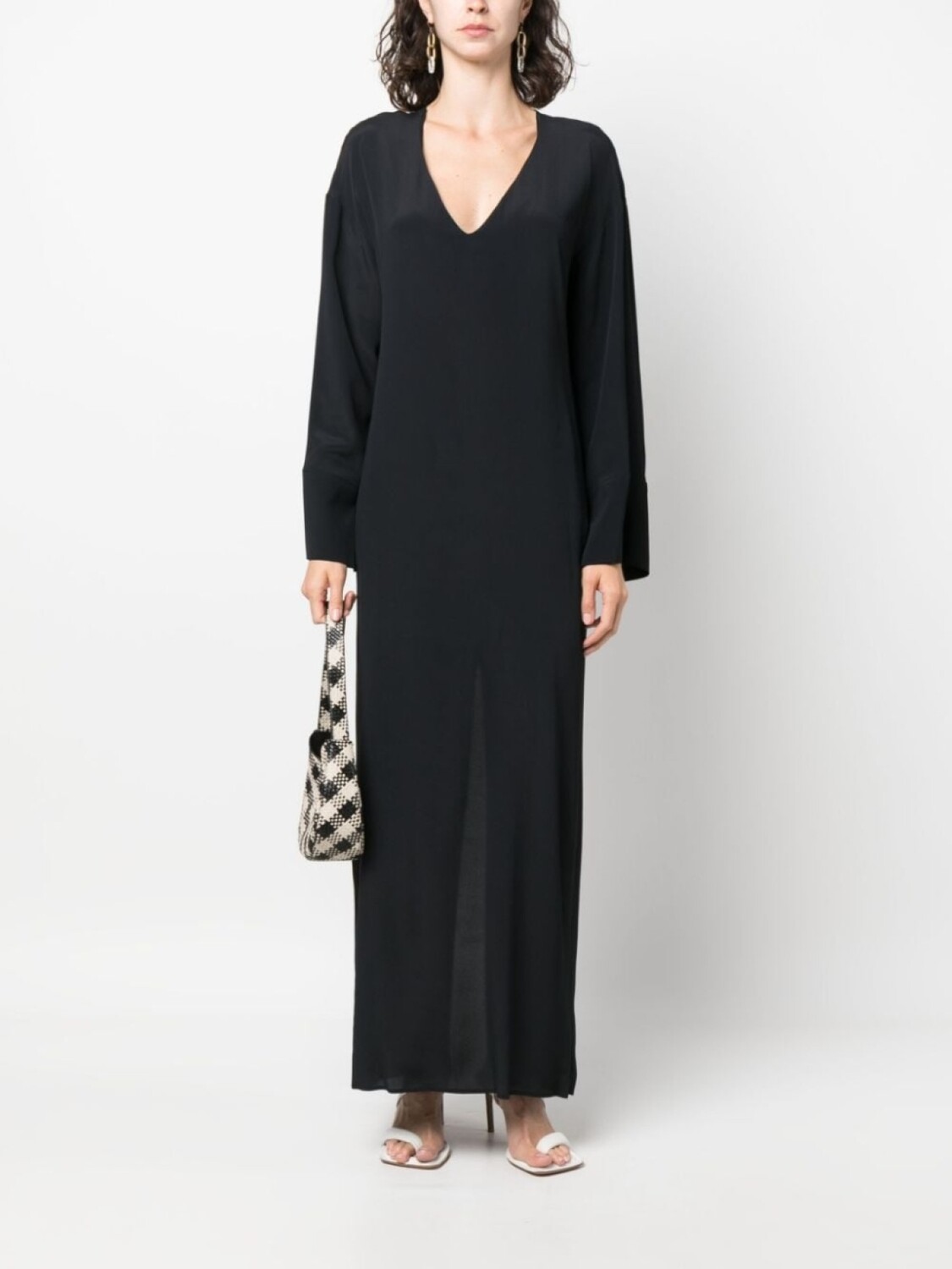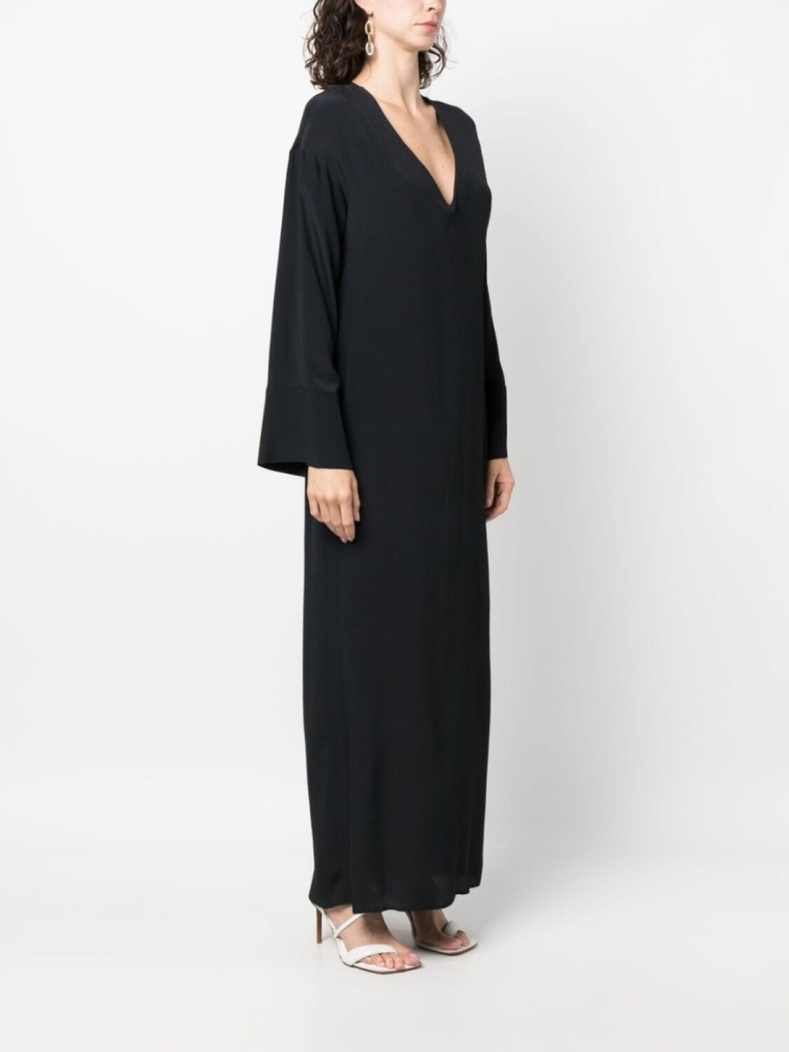 Черный, смесовый шелк, V-образный вырез, длинные рукава, вырез сзади и длинная модель.