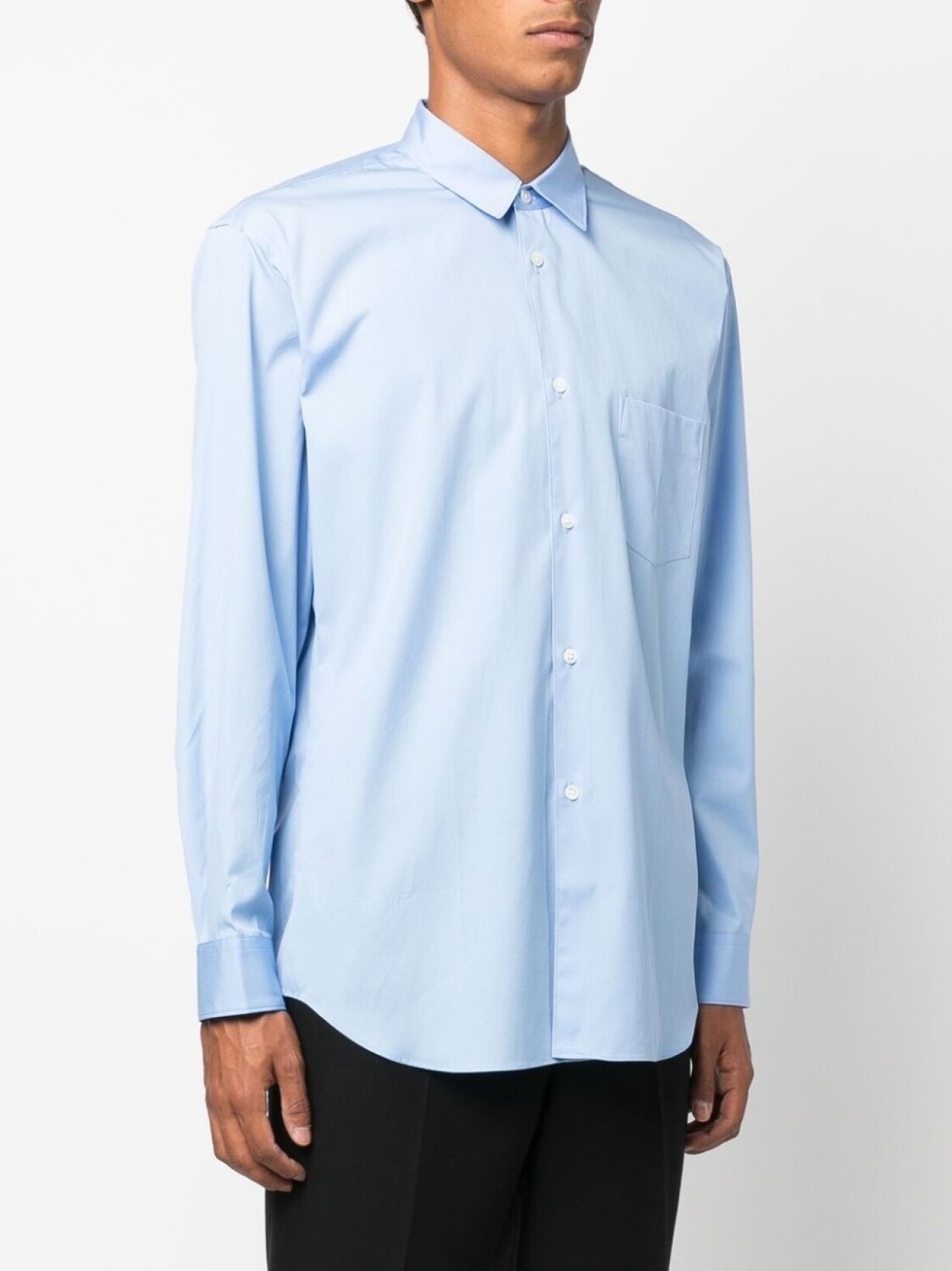Нежно-голубой, хлопок, классический воротник, застежка на пуговицах спереди, длинные рукава, манжеты на пуговицах, закругленный подол и нагрудный накладной карман.