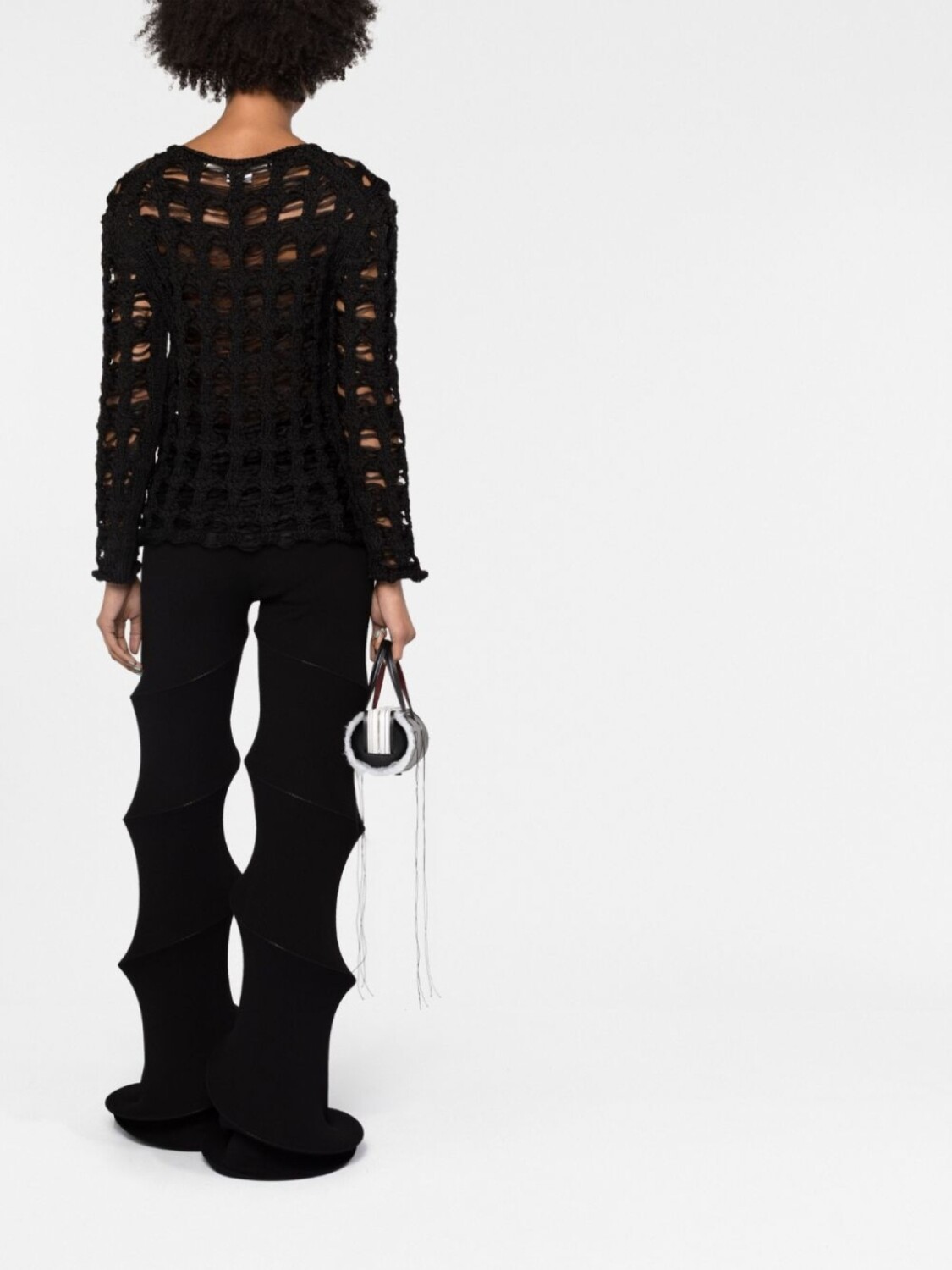 Черный, ажурная вязка, круглый вырез, длинные рукава и прямой подол.
