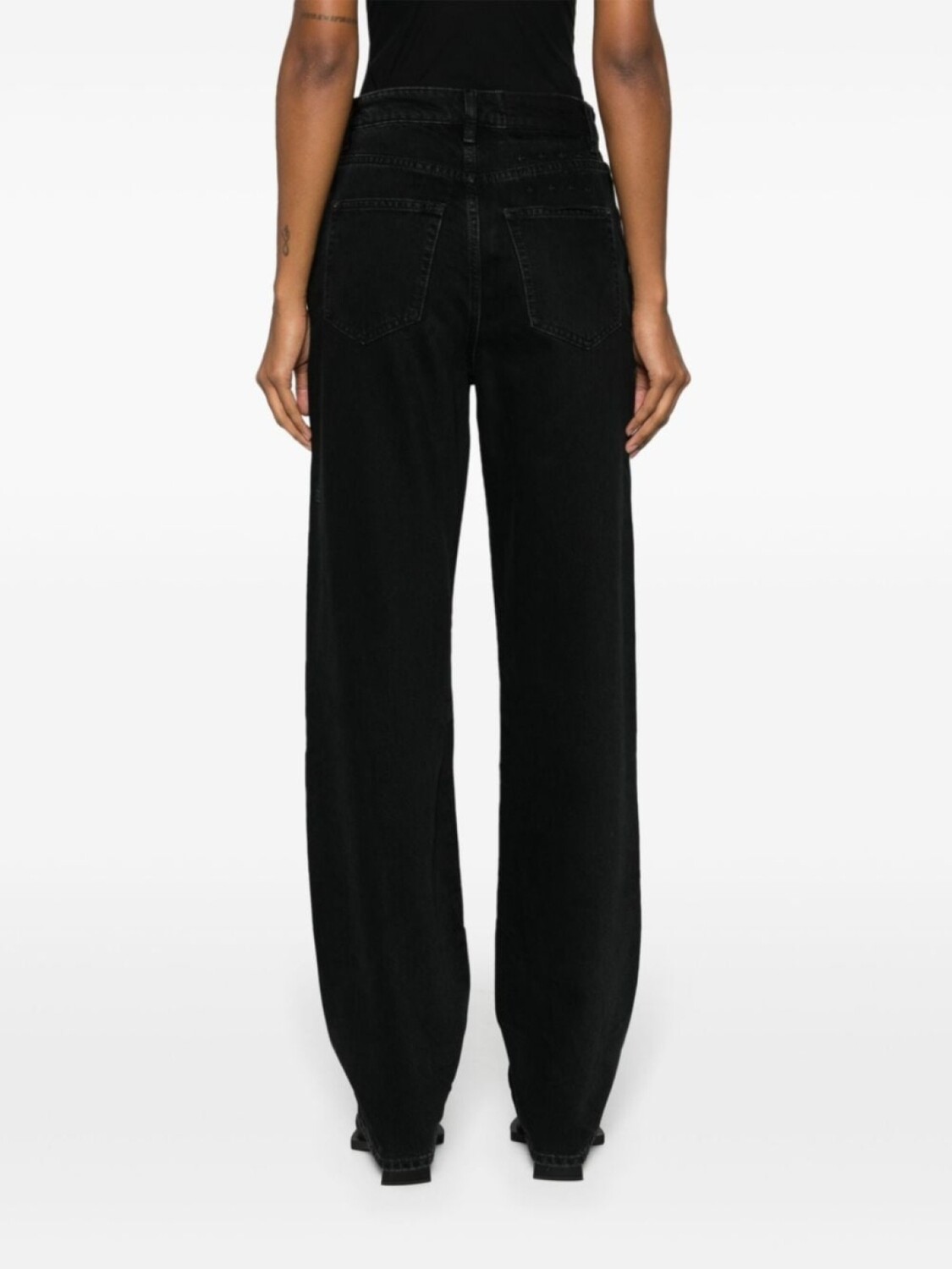 Черный, хлопок, деним, строчка в тон, нашивка с логотипом сзади, завышенная талия, ширинка на пуговицах, петли для ремня, пять карманов, прямой крой и прямой подол.