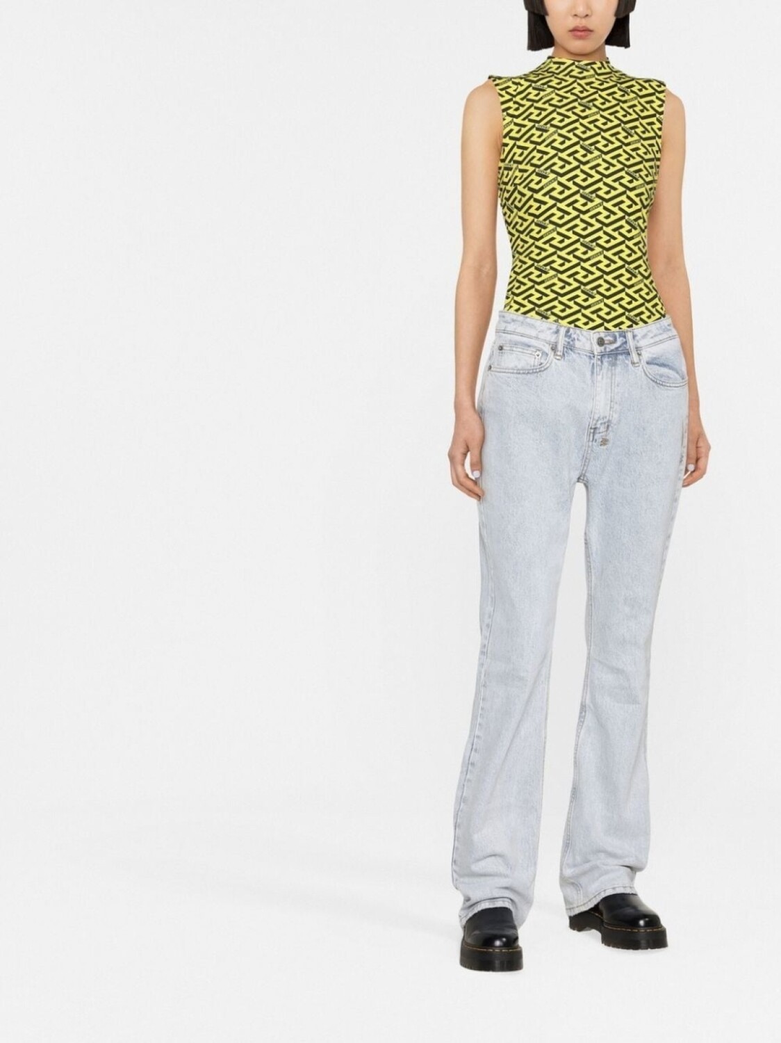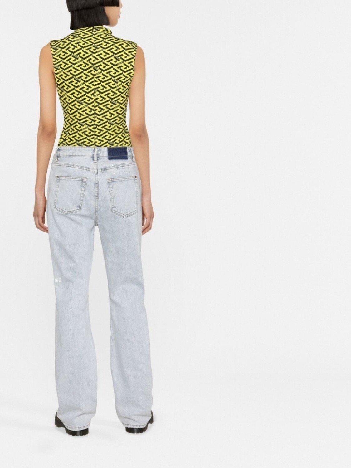 Голубой, эластичный хлопок, завышенная талия, петли для ремня, застежка на молнии и пуговице спереди, пять карманов и прямой крой.