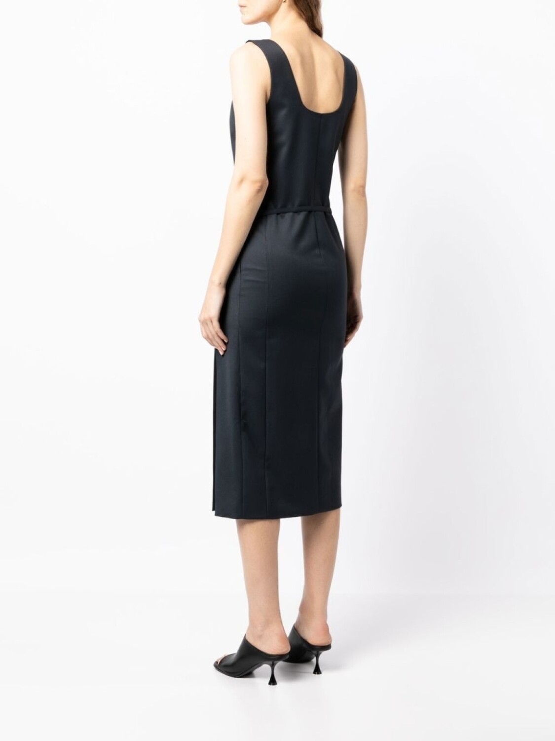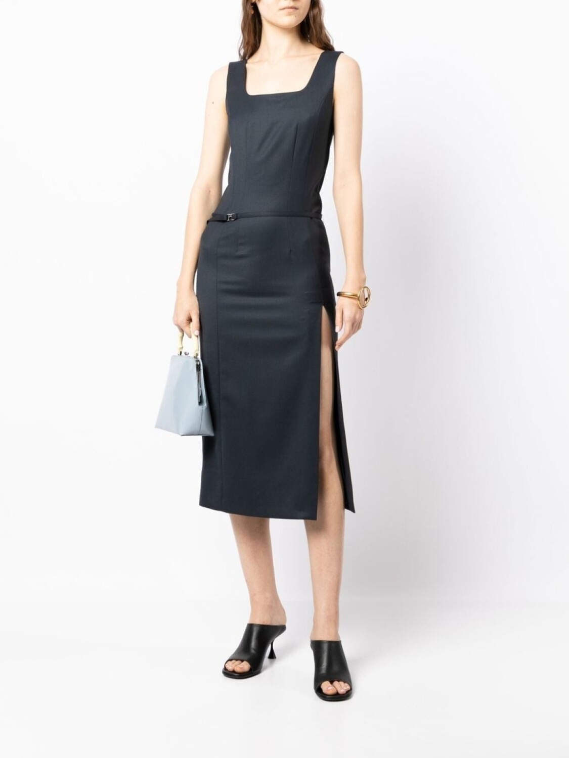 Темно-синий, смесовая шерсть, квадратный вырез, приталенный силуэт, съемный пояс, два выреза до бедер по бокам и прямой подол.
