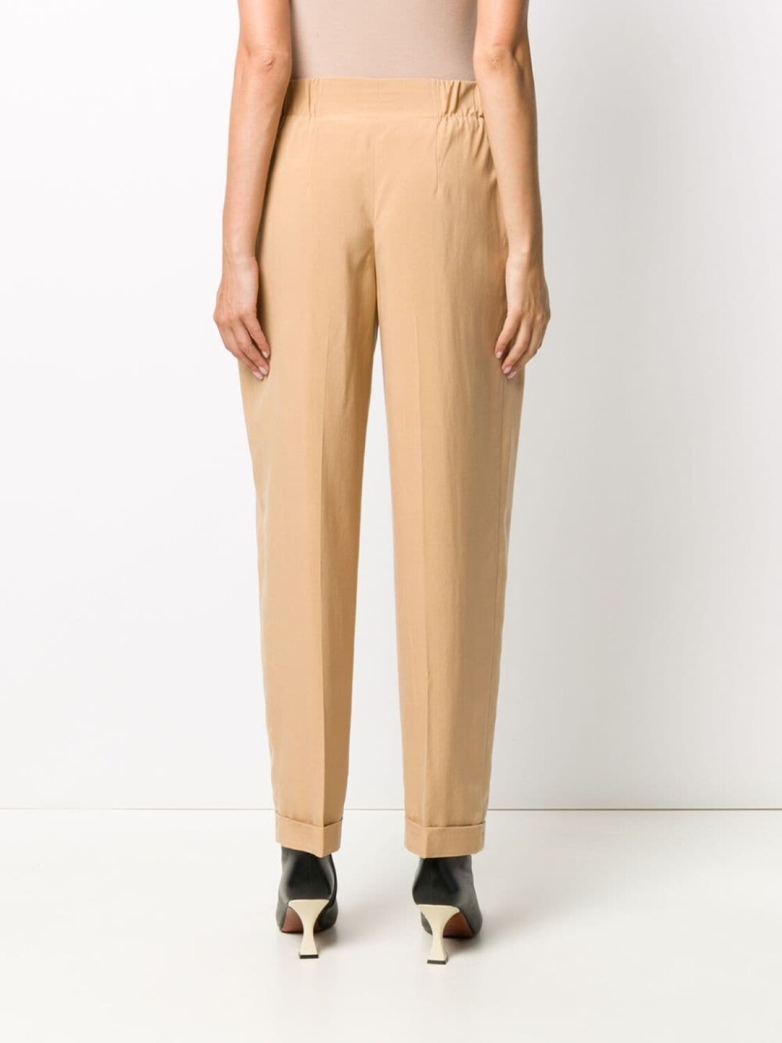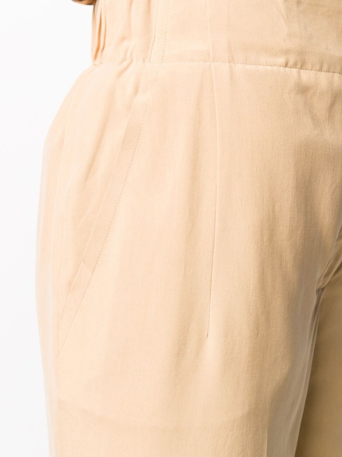 Прямой крой, завышенная талия, эластичный пояс и два прорезных кармана по бокам.