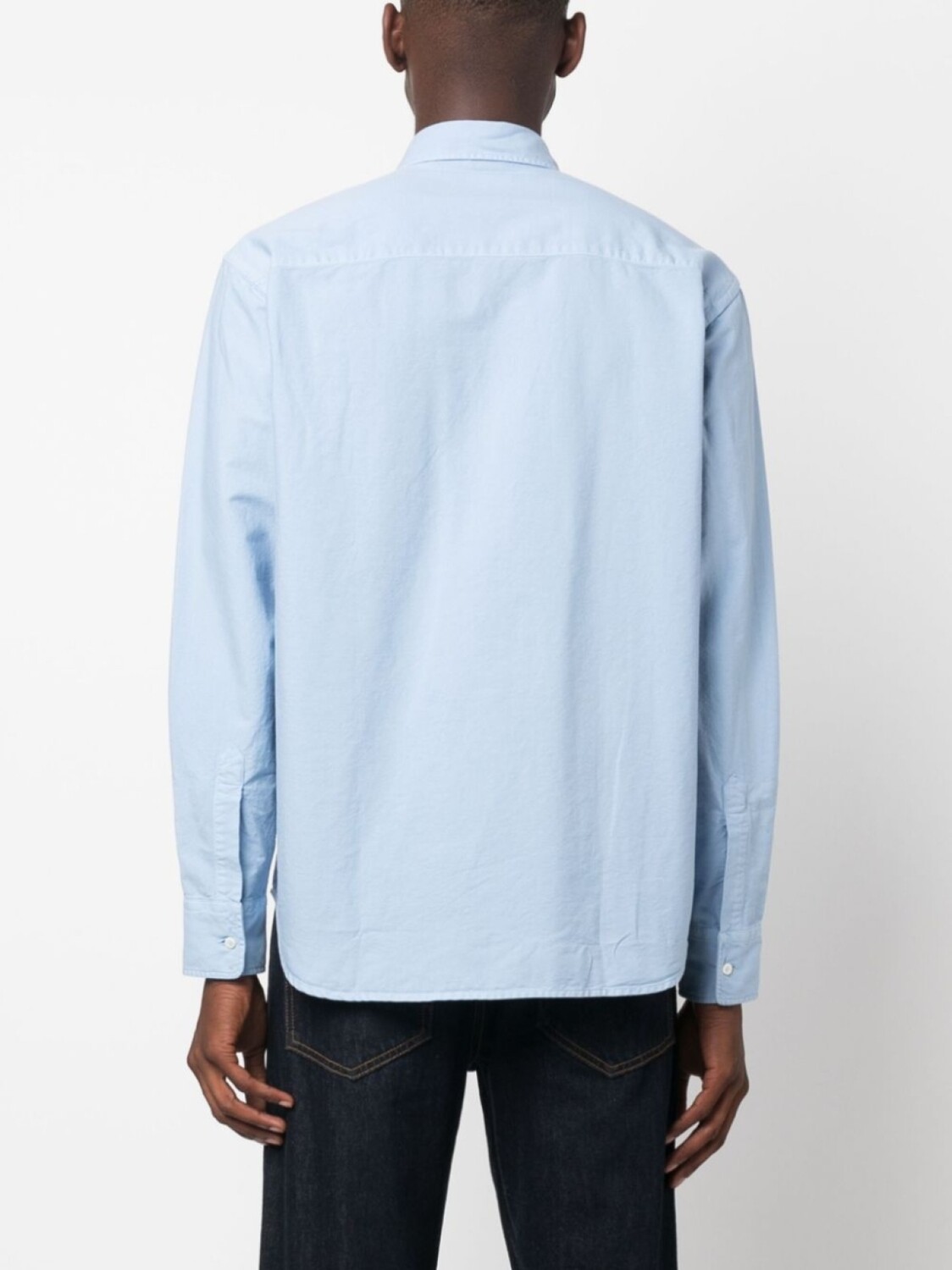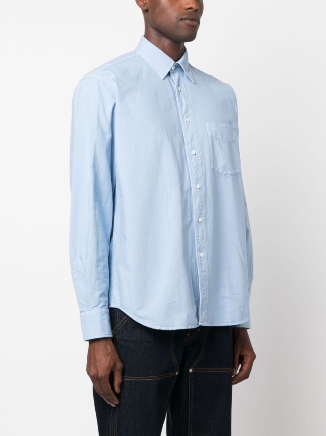 Голубой, хлопок, классический воротник, нагрудный накладной карман, длинные рукава, застежка на пуговицах спереди и прямой подол.