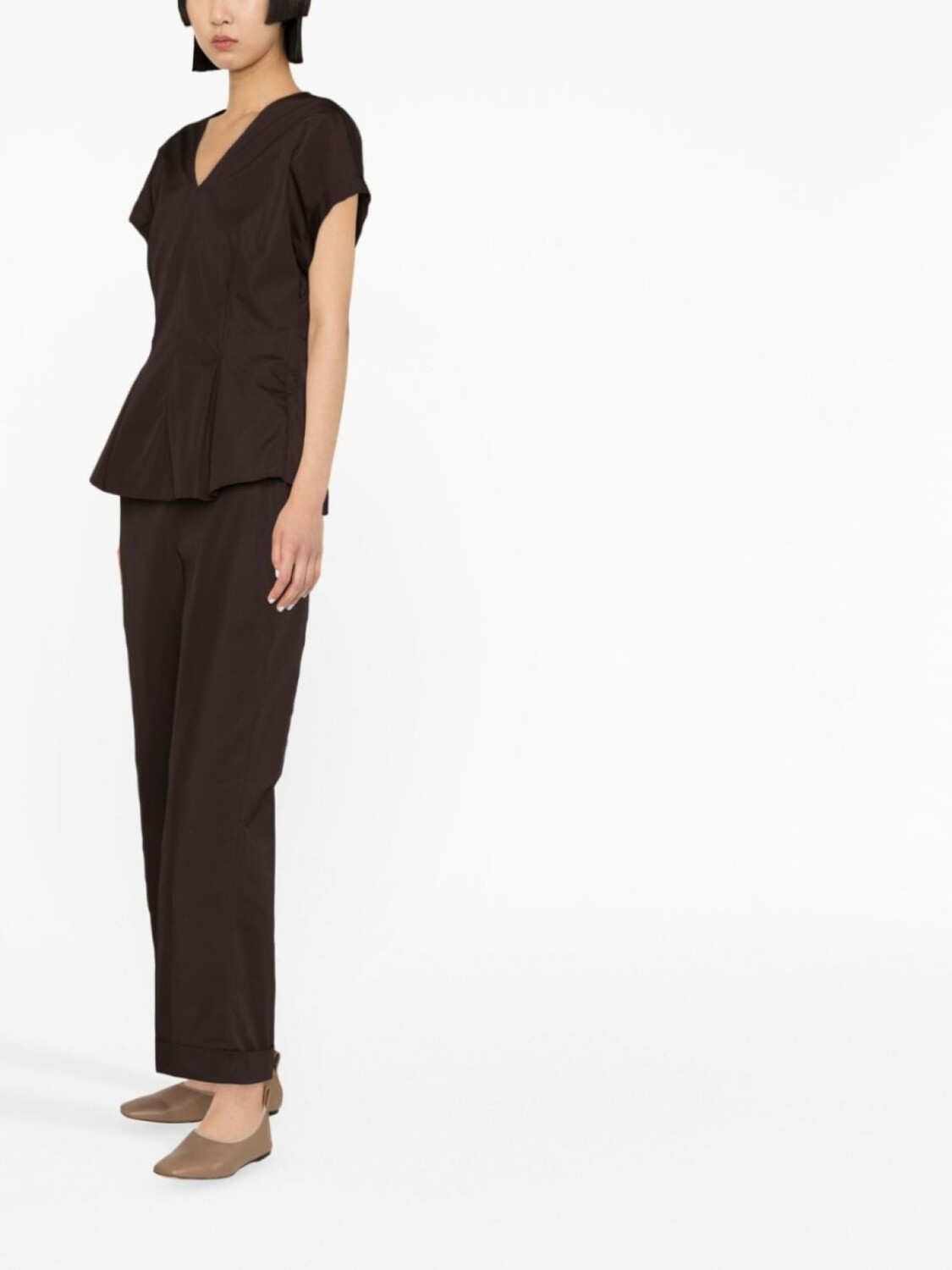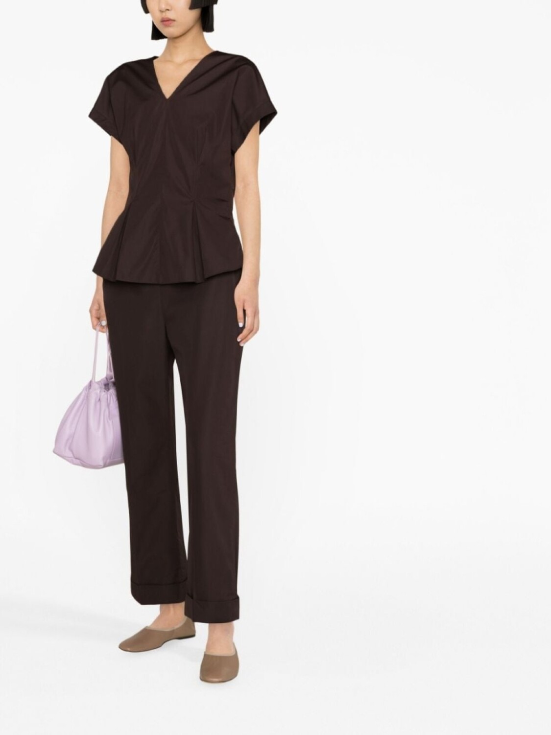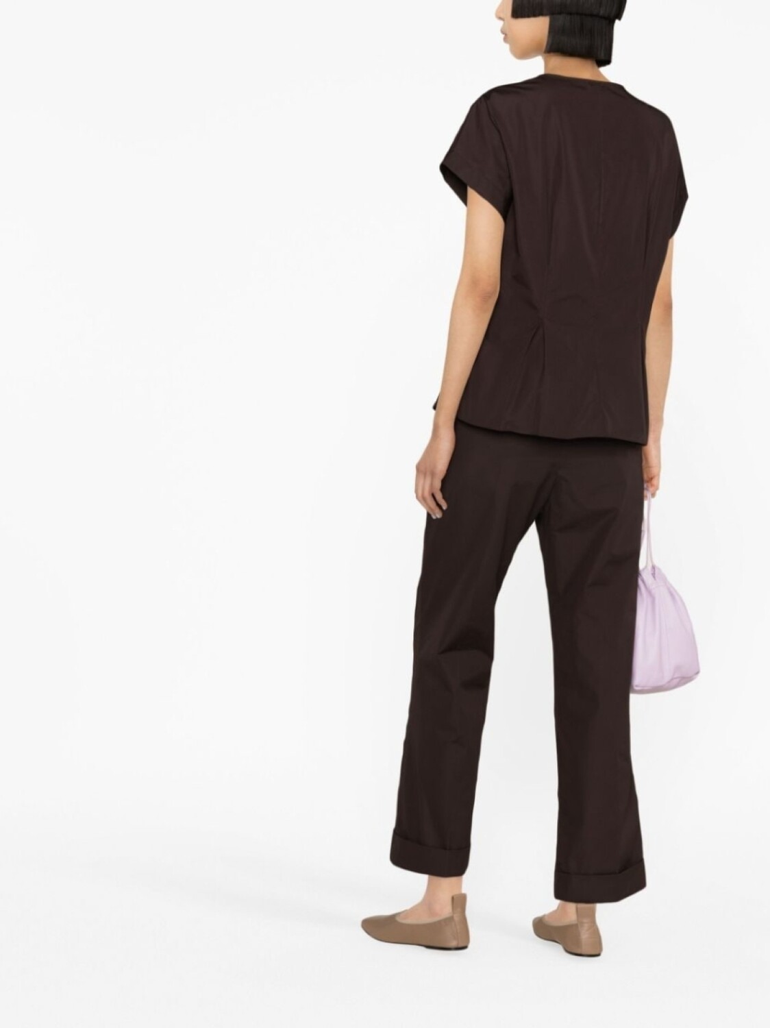 Шоколадный, хлопок, стрелки, два вшитых кармана по бокам, прорезной карман на пуговице сзади, крой bootcut, укороченная длина и подвороты.