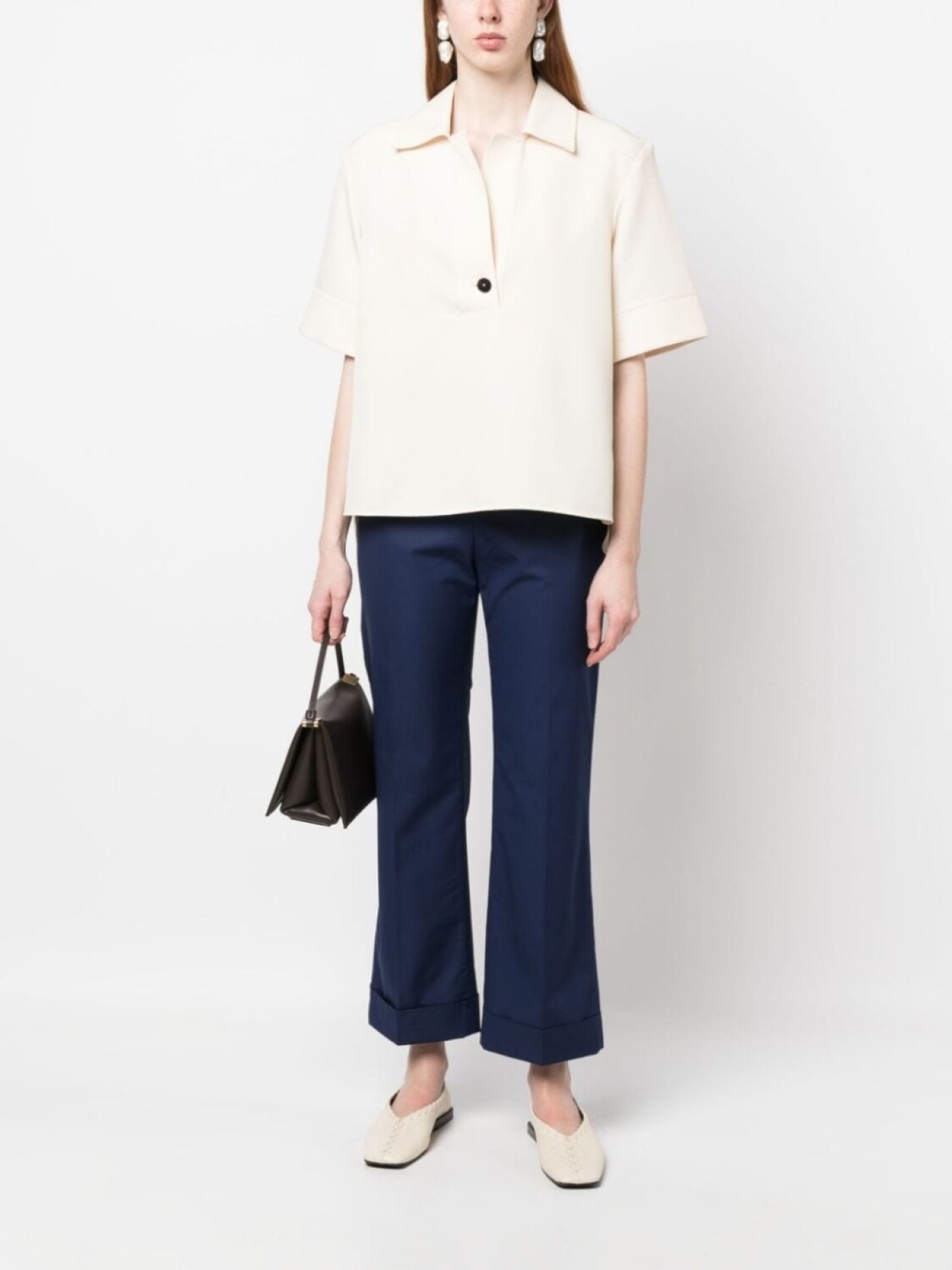 Темно-синий, хлопок, средняя посадка, расклешенный крой, два вшитых кармана по бокам, прорезной карман на пуговице сзади, подвернутые манжеты и укороченная длина.