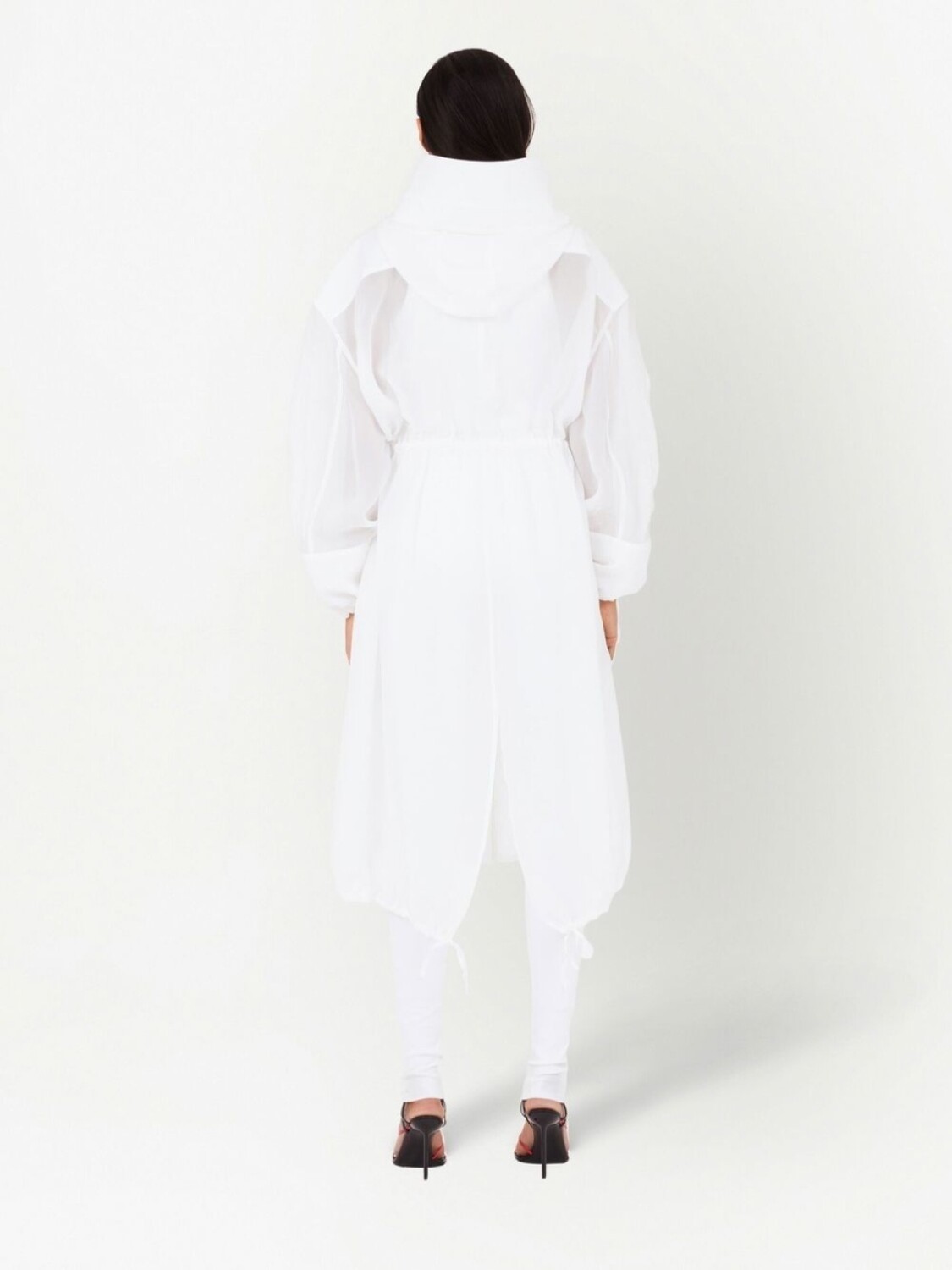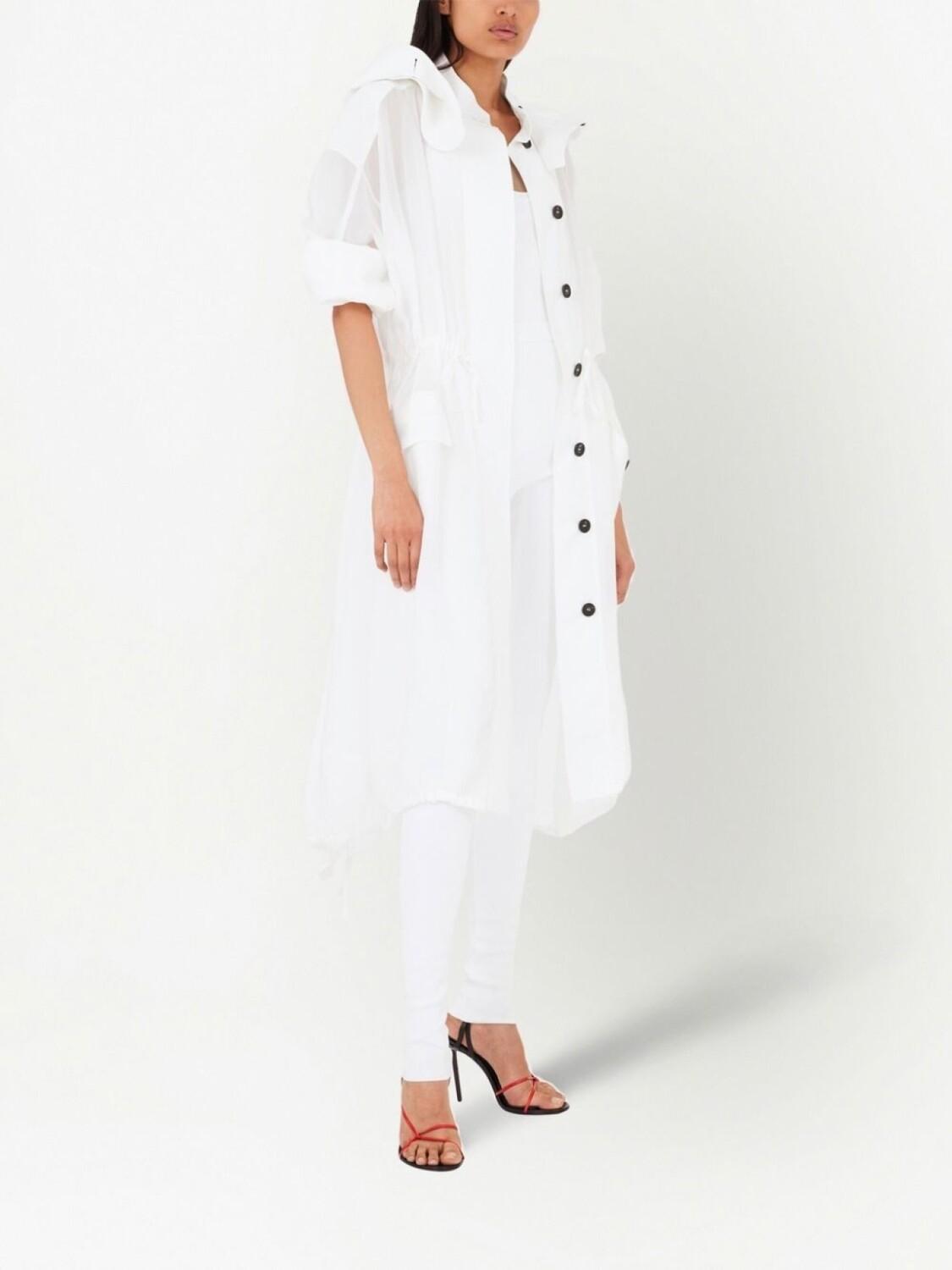 Белый, смесь шелка и хлопка, органза, модель без подкладки, застежка на пуговицах спереди, эластичный пояс, эластичные манжеты и длинные рукава.