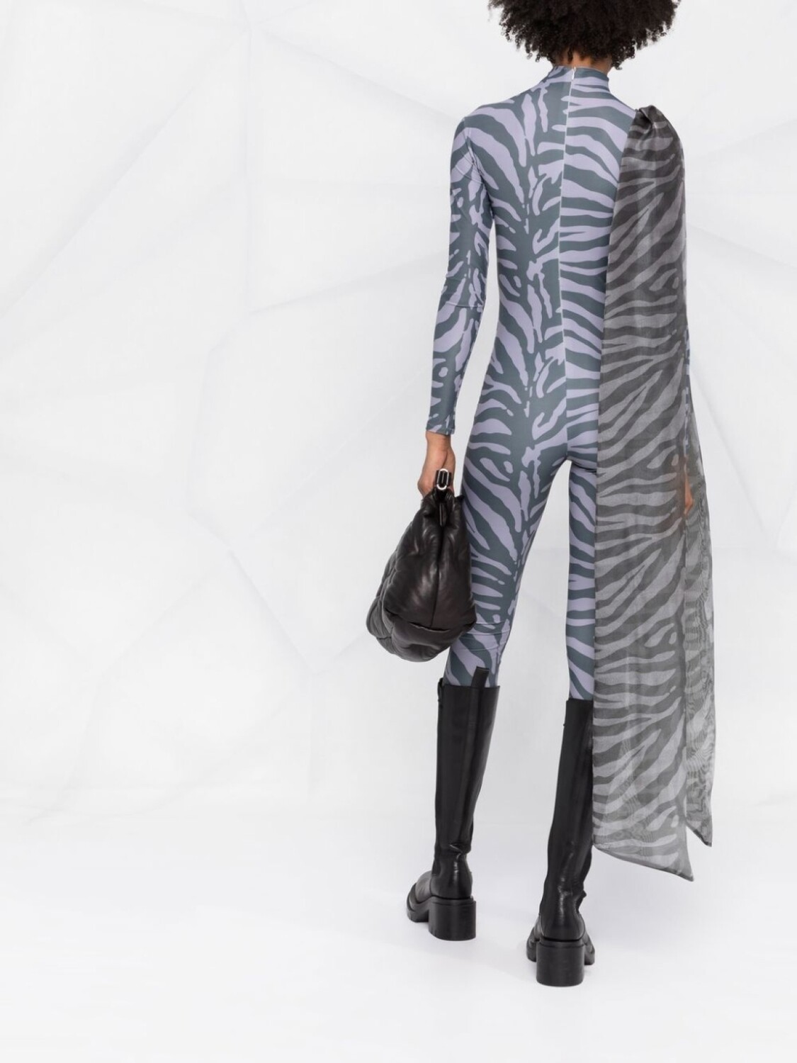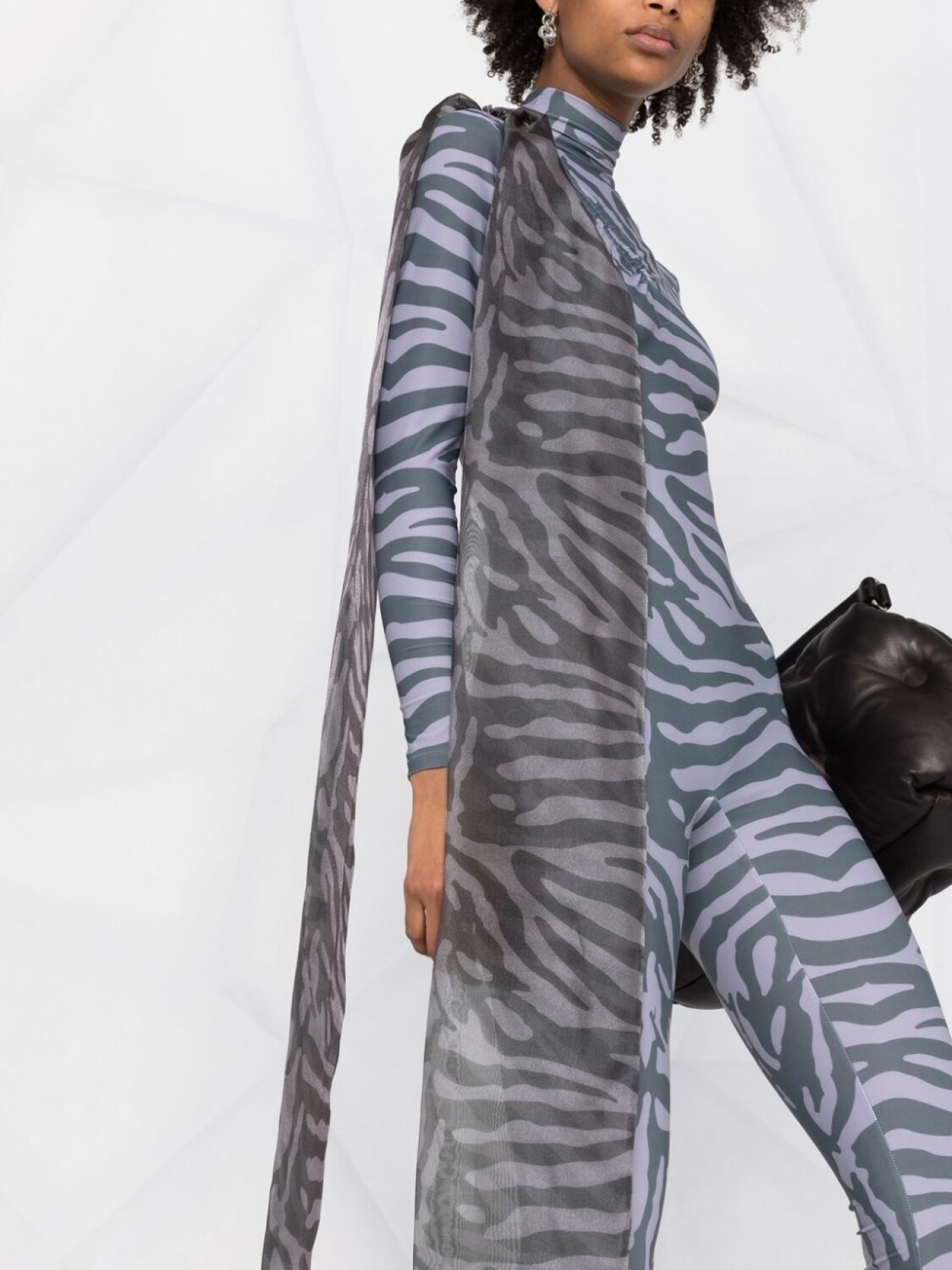 Серый, зебровый принт, крупный бант, высокий воротник, застежка на молнии сзади, длинные рукава и облегающий крой.