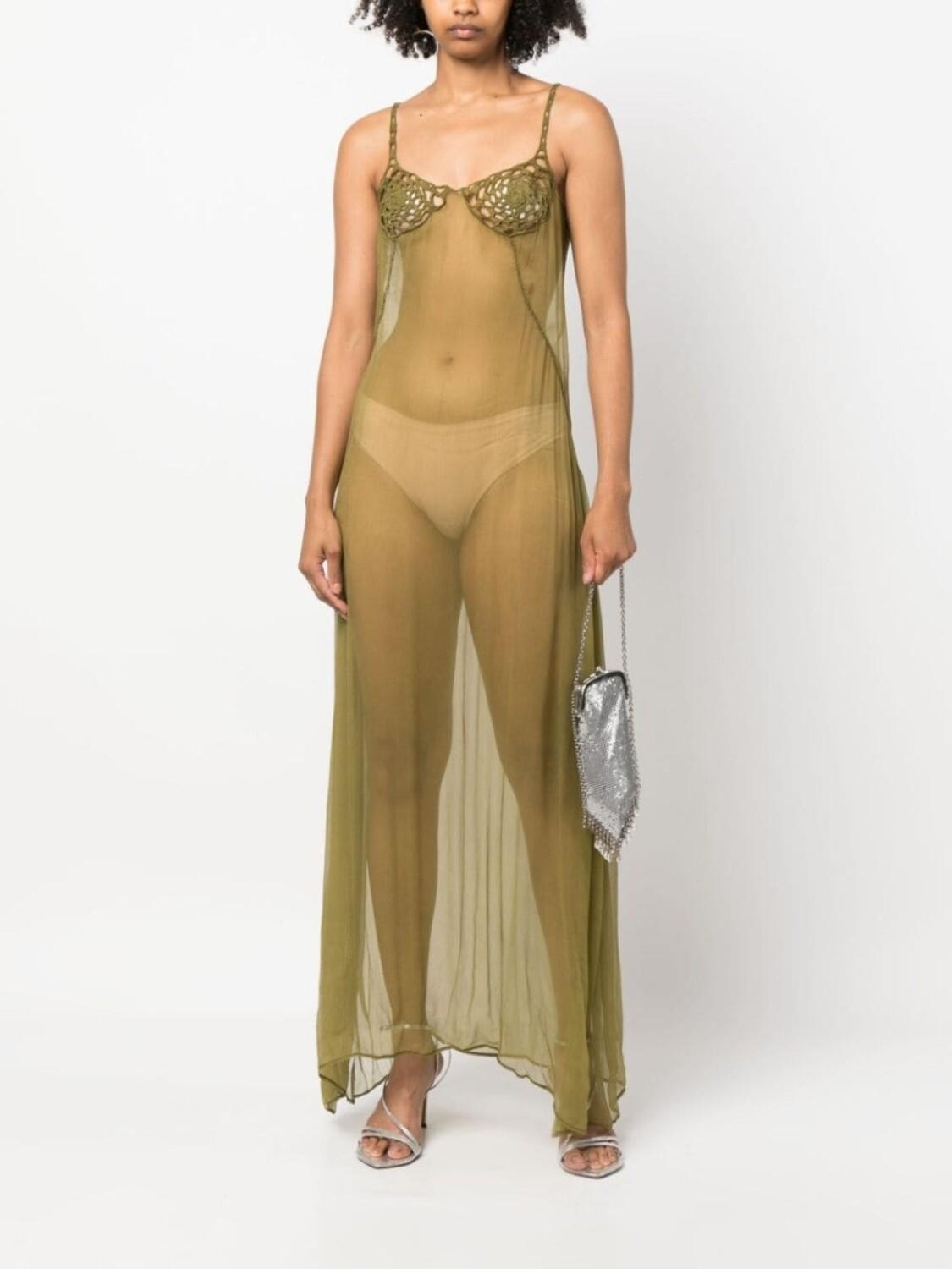Зеленый, прозрачный материал, вставки в технике кроше, вырез в форме сердца, регулируемые лямки, открытая спина, шнуровка сзади и длина миди.