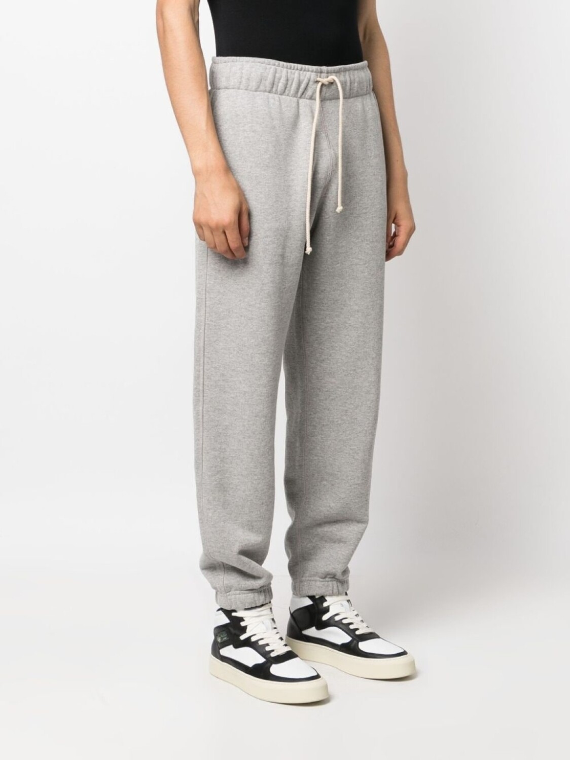Светло-серый, хлопок, нашивка с логотипом сбоку, кулиска на талии, два вшитых кармана по бокам, прямой крой, эластичные манжеты и прямой подол.