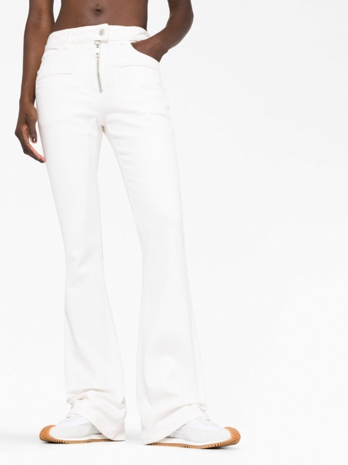 Белый, эластичный хлопок, деним, петли для ремня, застежка на молнии и пуговице спереди, низкая посадка, расклешенный крой, крой bootcut и пять карманов.