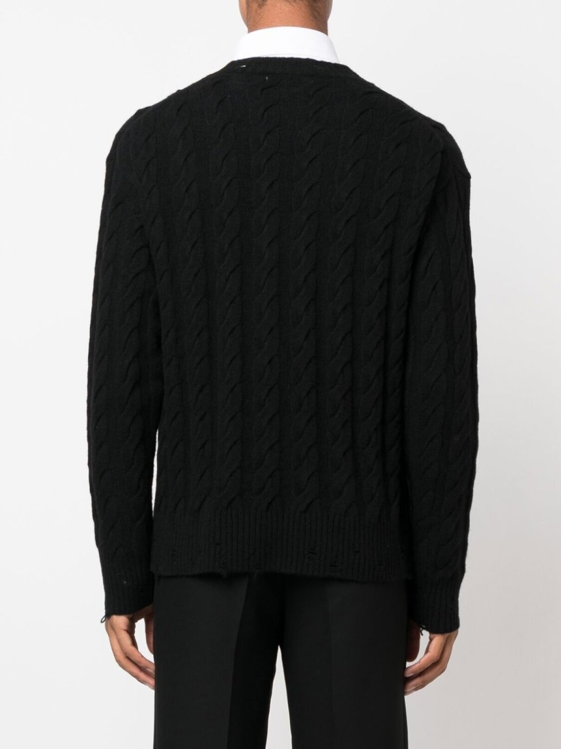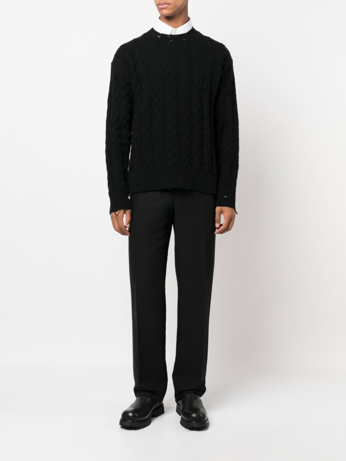 Черный, смесовая шерсть мериноса, фактурная вязка, круглый вырез, длинные рукава и подол в рубчик.
