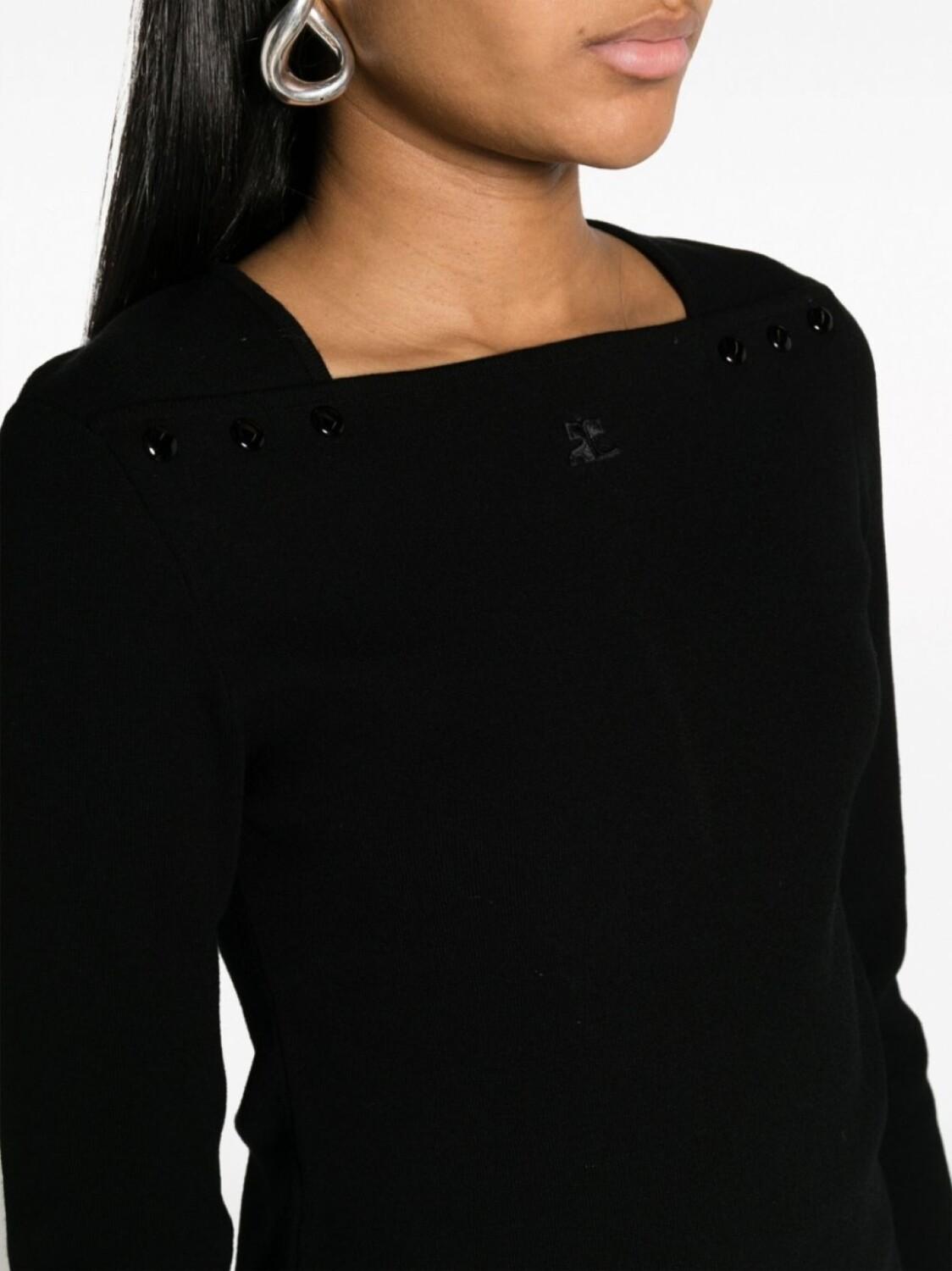 Черный, декоративные пуговицы, вышитый логотип спереди, квадратный вырез, длинные рукава и прямой подол.