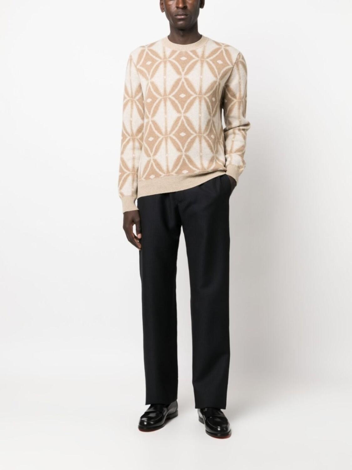 Темно-синий, хлопок, смесь шерсти и мохера, узор с изображением монограммы, средняя посадка, эластичный пояс, застежка на пуговицах спереди, петли для ремня и прямой крой.