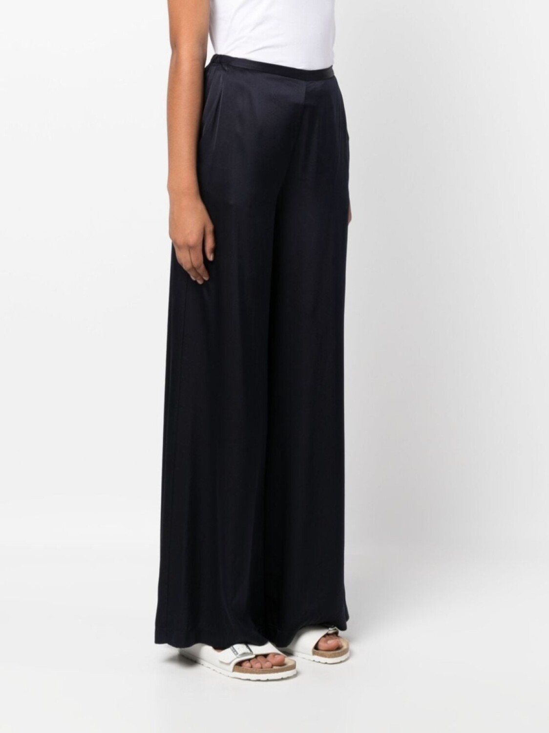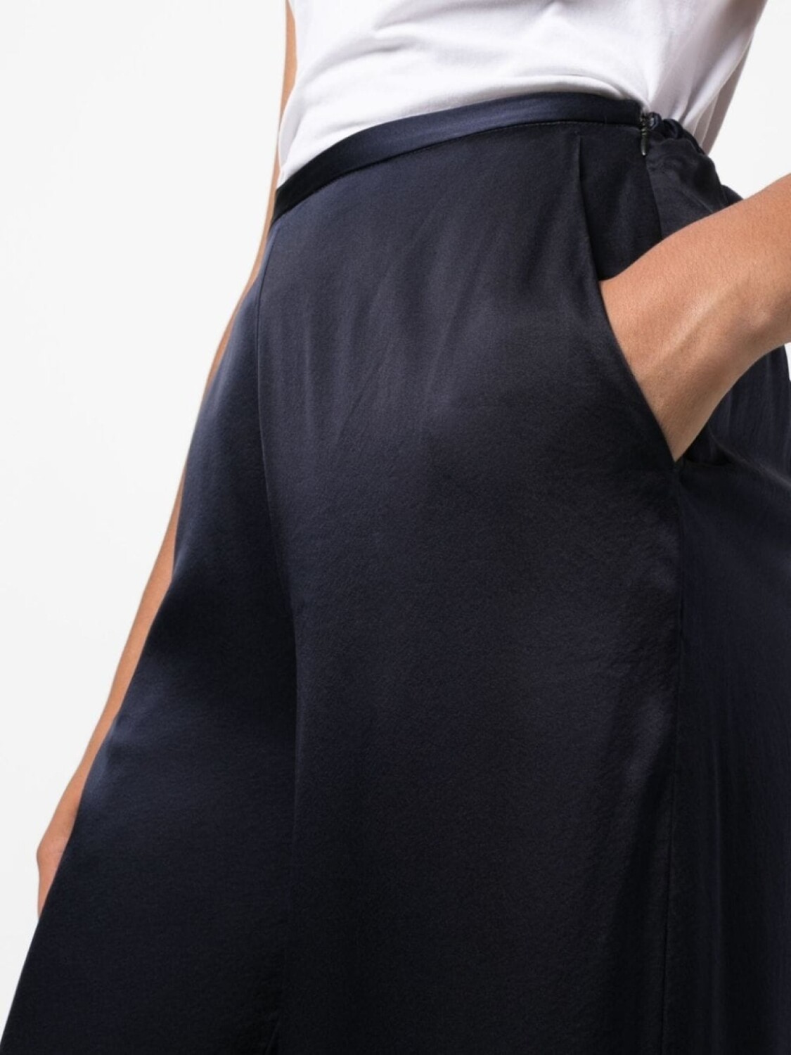 Темно-синий, эластичный шелк, сатиновая фактура, завышенная талия, два вшитых кармана по бокам, эластичный пояс сзади и широкий крой.