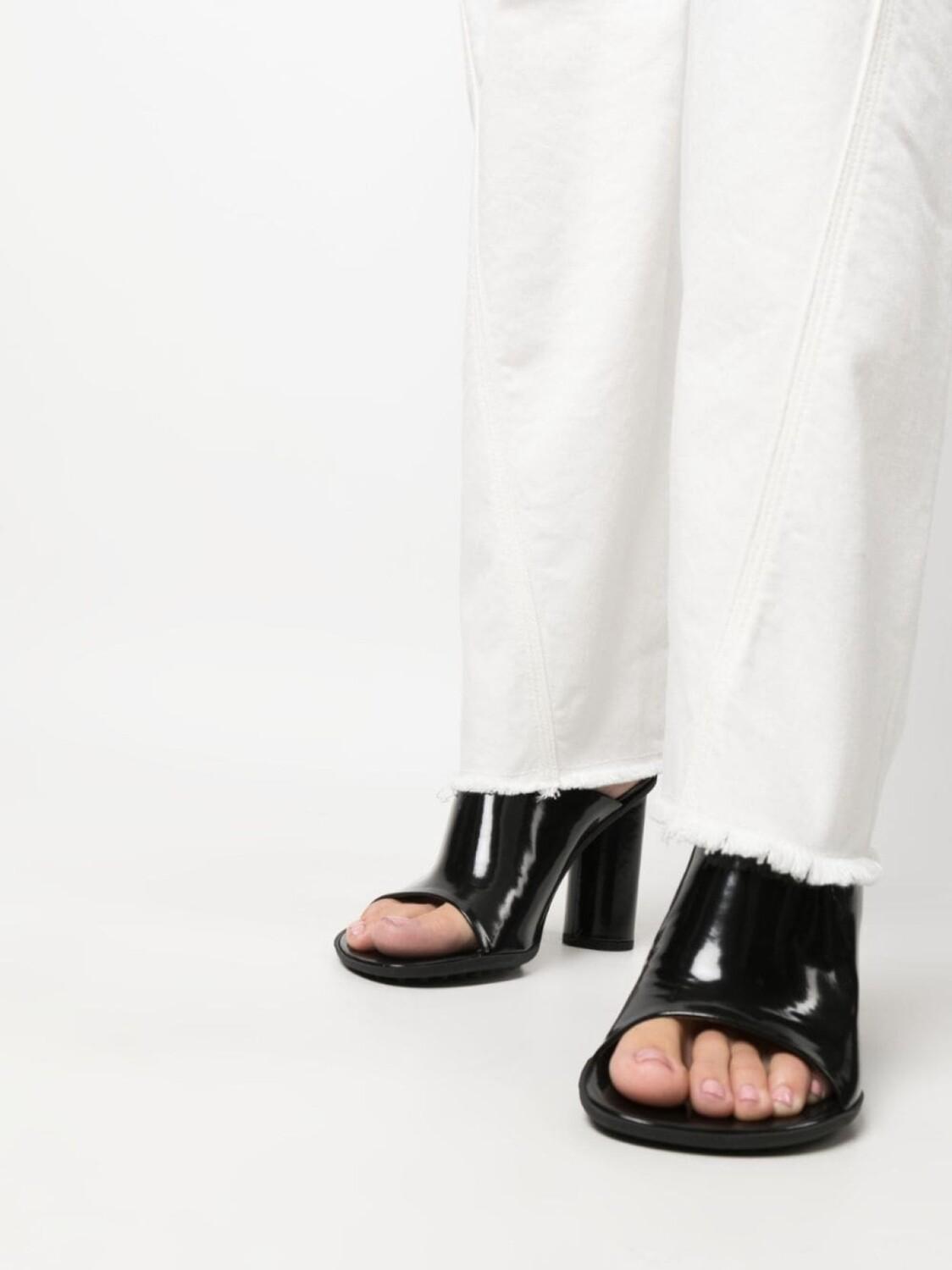 Белый, эластичный хлопок, прямой крой, края с бахромой, петли для ремня, нашивка с логотипом сзади, ширинка на пуговицах и пять карманов.