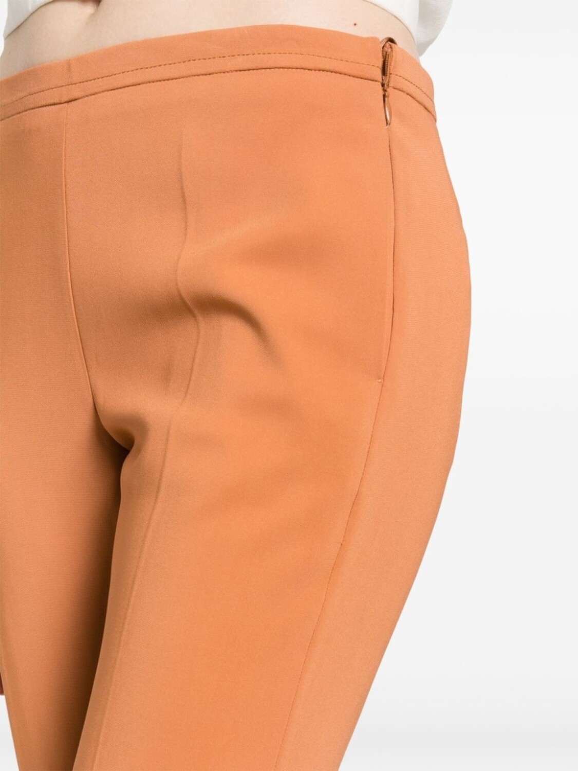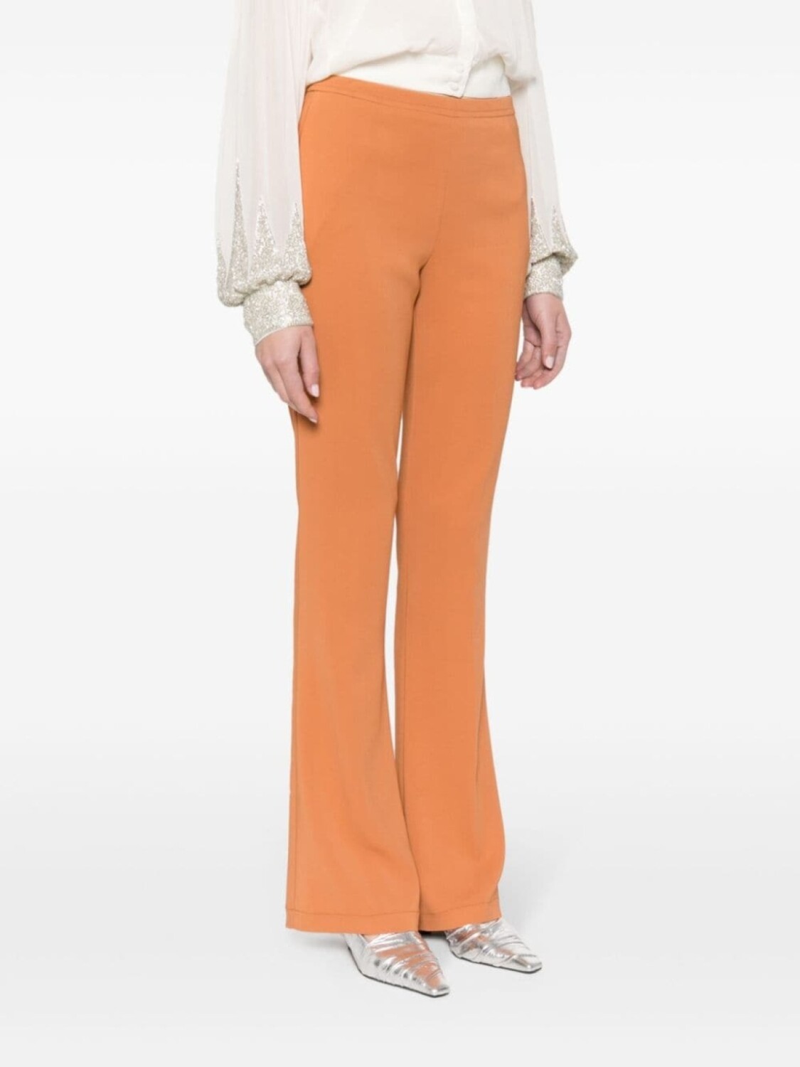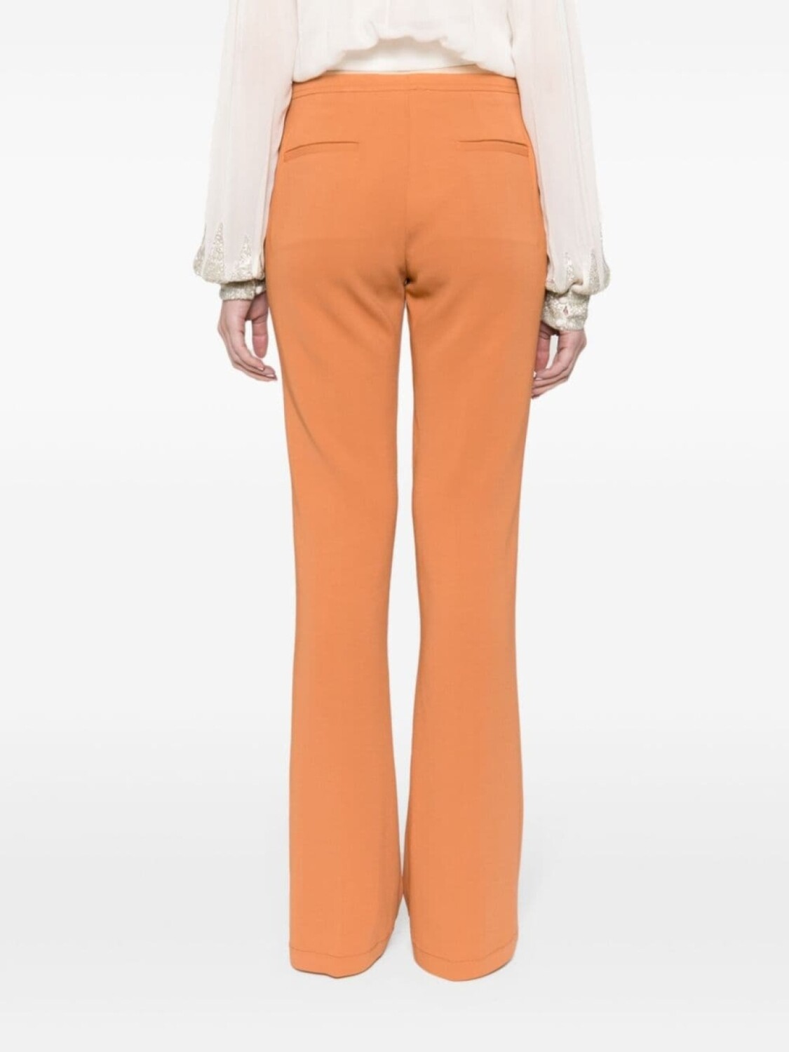 Мандариново-оранжевый, эластичный материал, стрелки, средняя посадка, расклешенный крой, строгий крой, потайная застежка на молнии сбоку, два прорезных кармана по бокам и два прорезных кармана сзади.