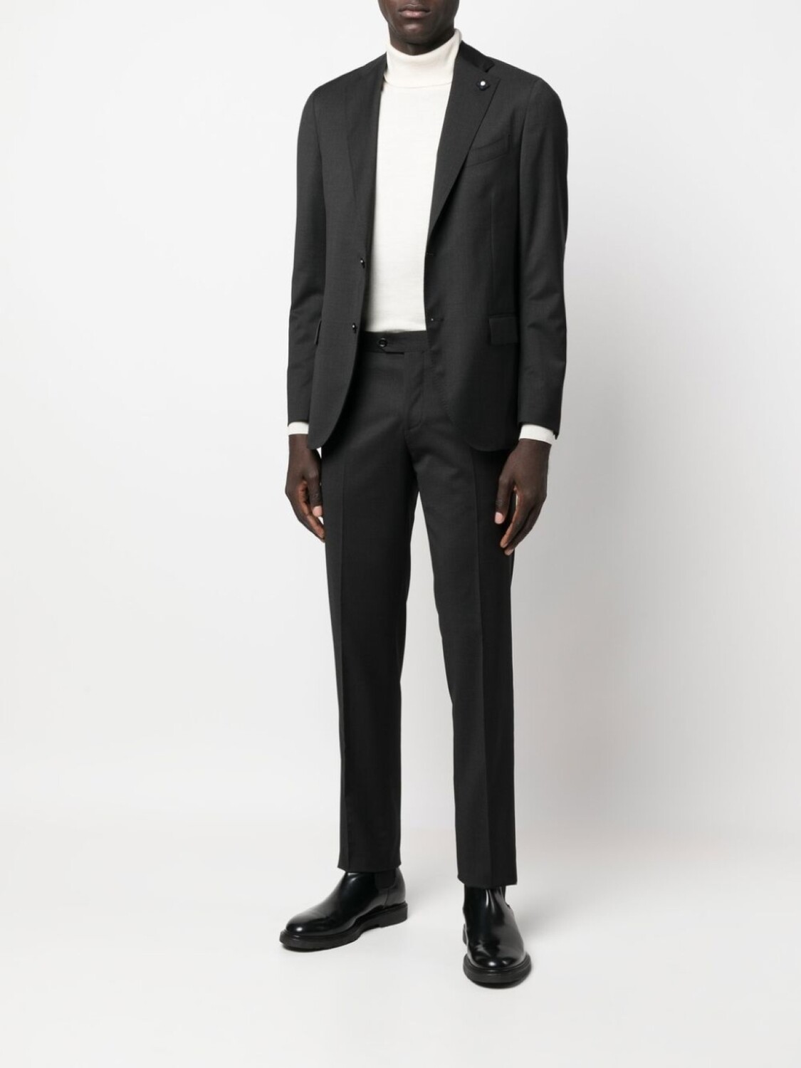 Темно-серый, эластичная шерсть, строгий крой, стрелки, потайная застежка на молнии и пуговицах, петли для ремня, два кармана по бокам и два прорезных кармана на пуговицах сзади.