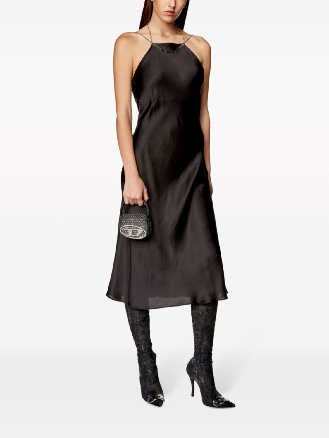 Черный, сатиновая фактура, два цепочных ремня на плечо, металлический декор, вырез-петля халтер, без рукавов, открытая спина, прямой подол и длина миди.