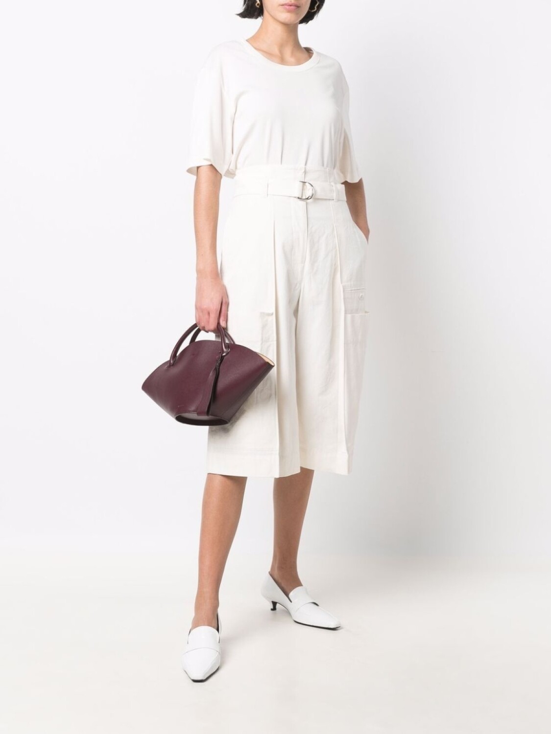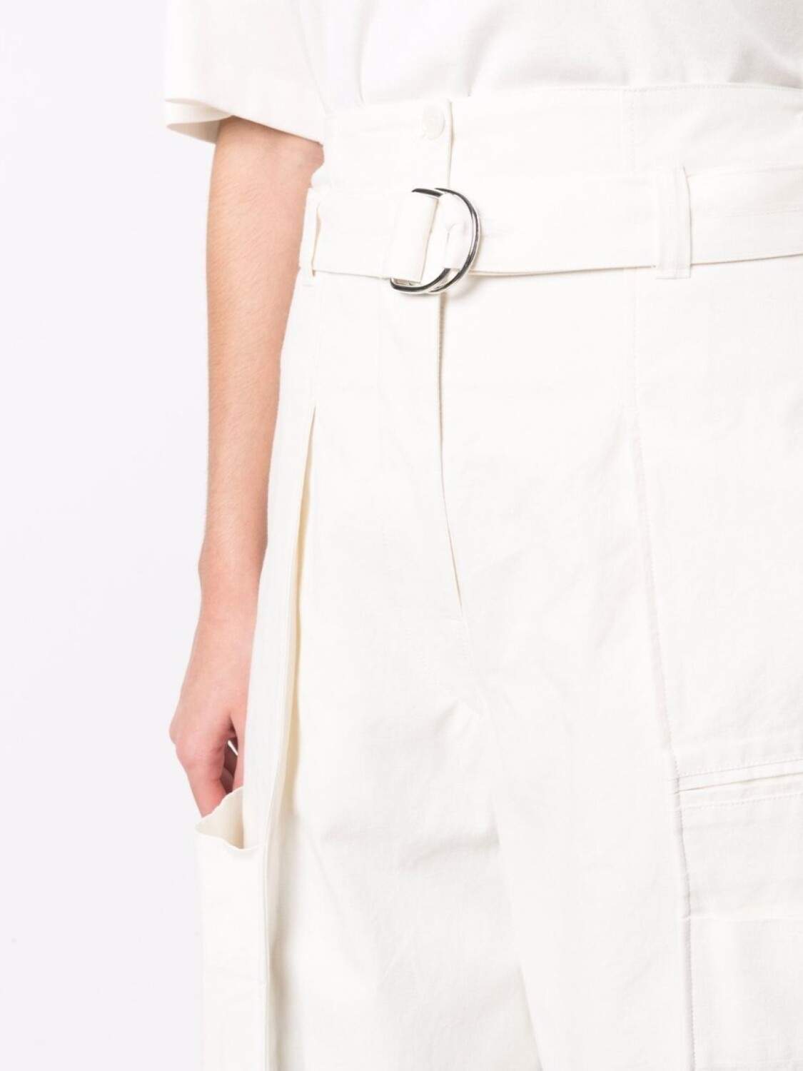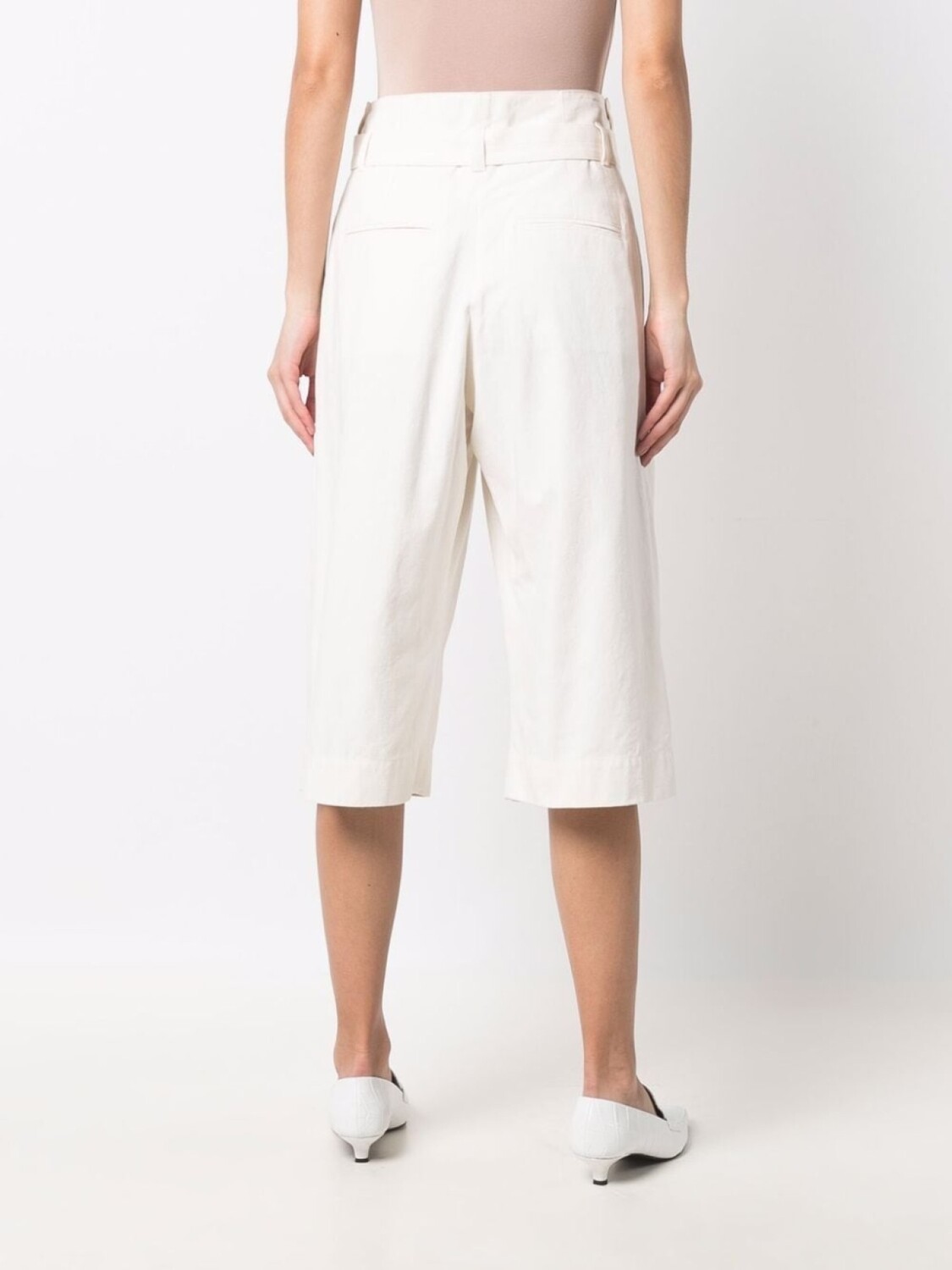 Ремень на талии, петли для ремня, застежка на молнии и пуговице спереди, складки, два накладных кармана спереди и два кармана с листочкой сзади.