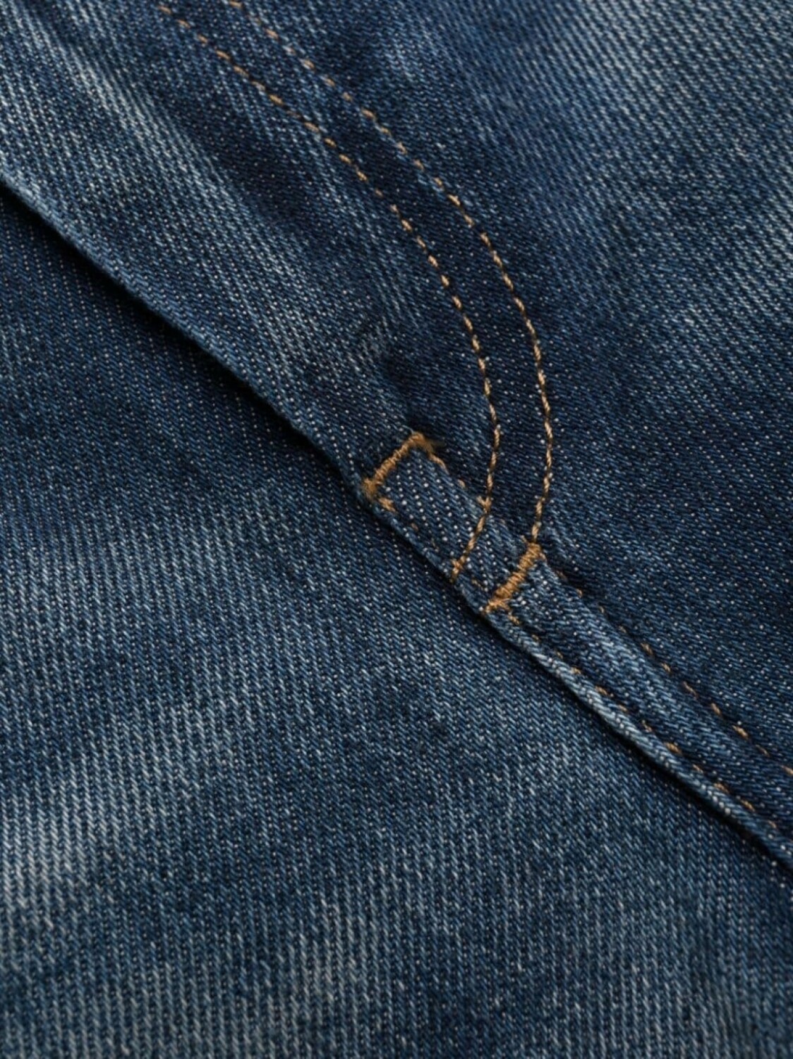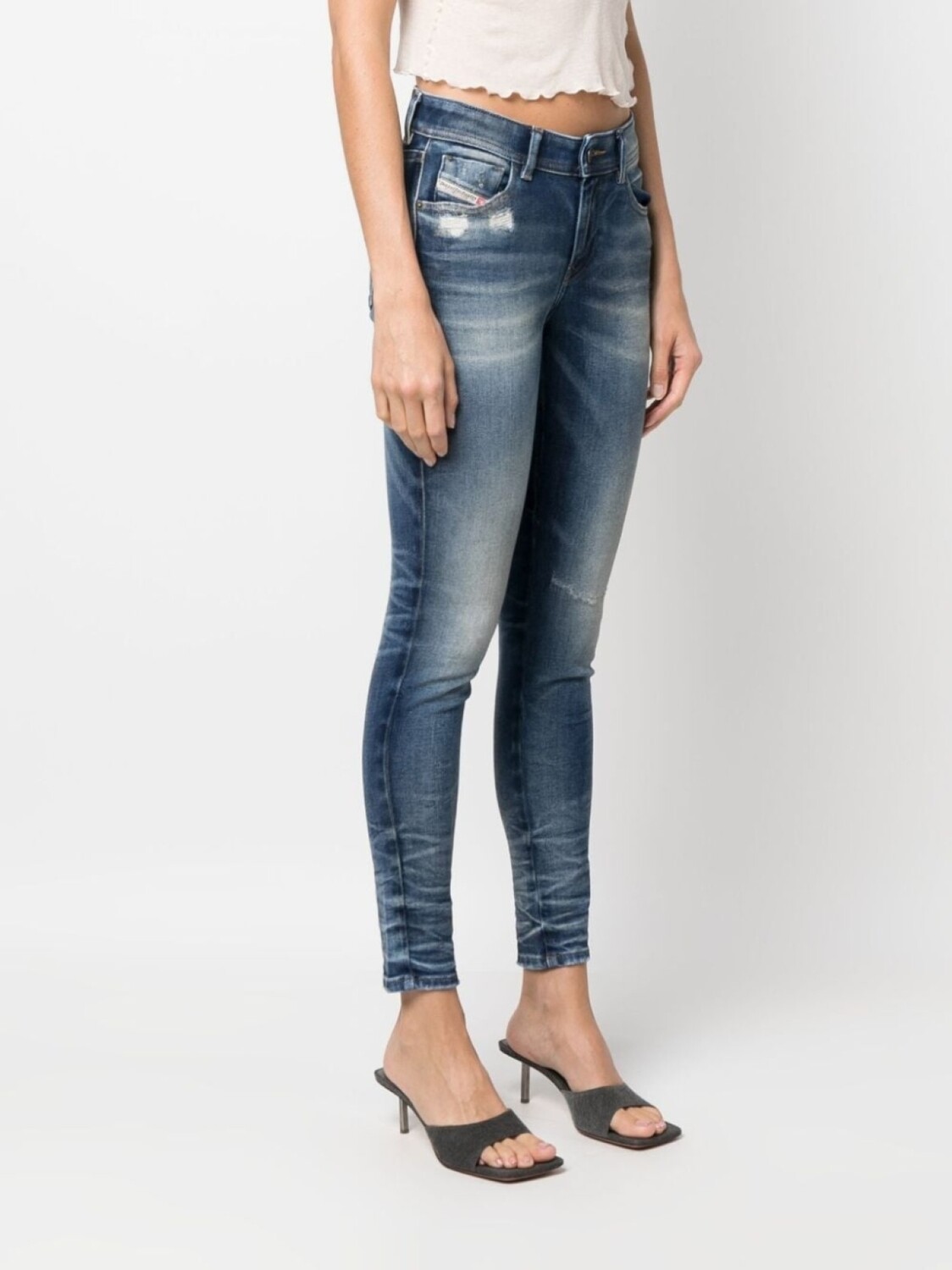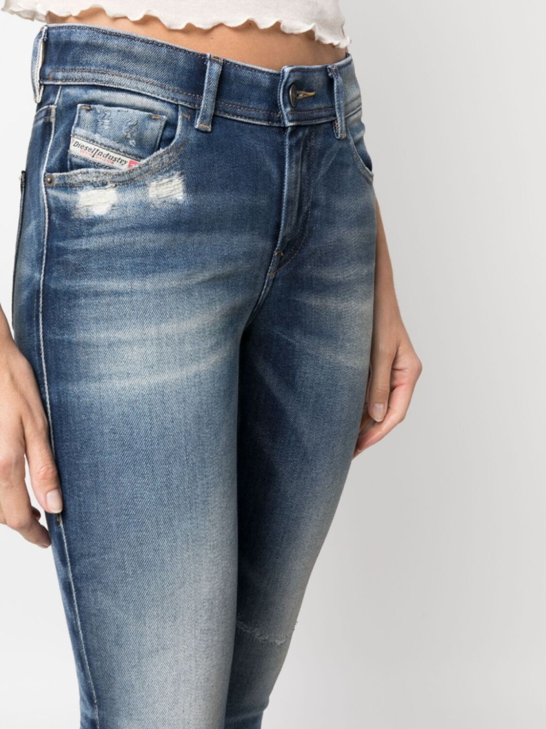 Синий, эластичный хлопок, деним, эффект потертости, нашивка с логотипом сзади, петли для ремня, застежка на молнии и пуговице спереди, облегающий крой и пять карманов.