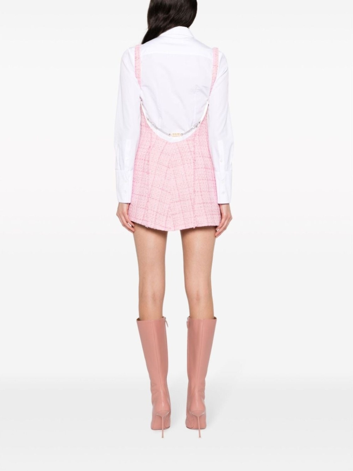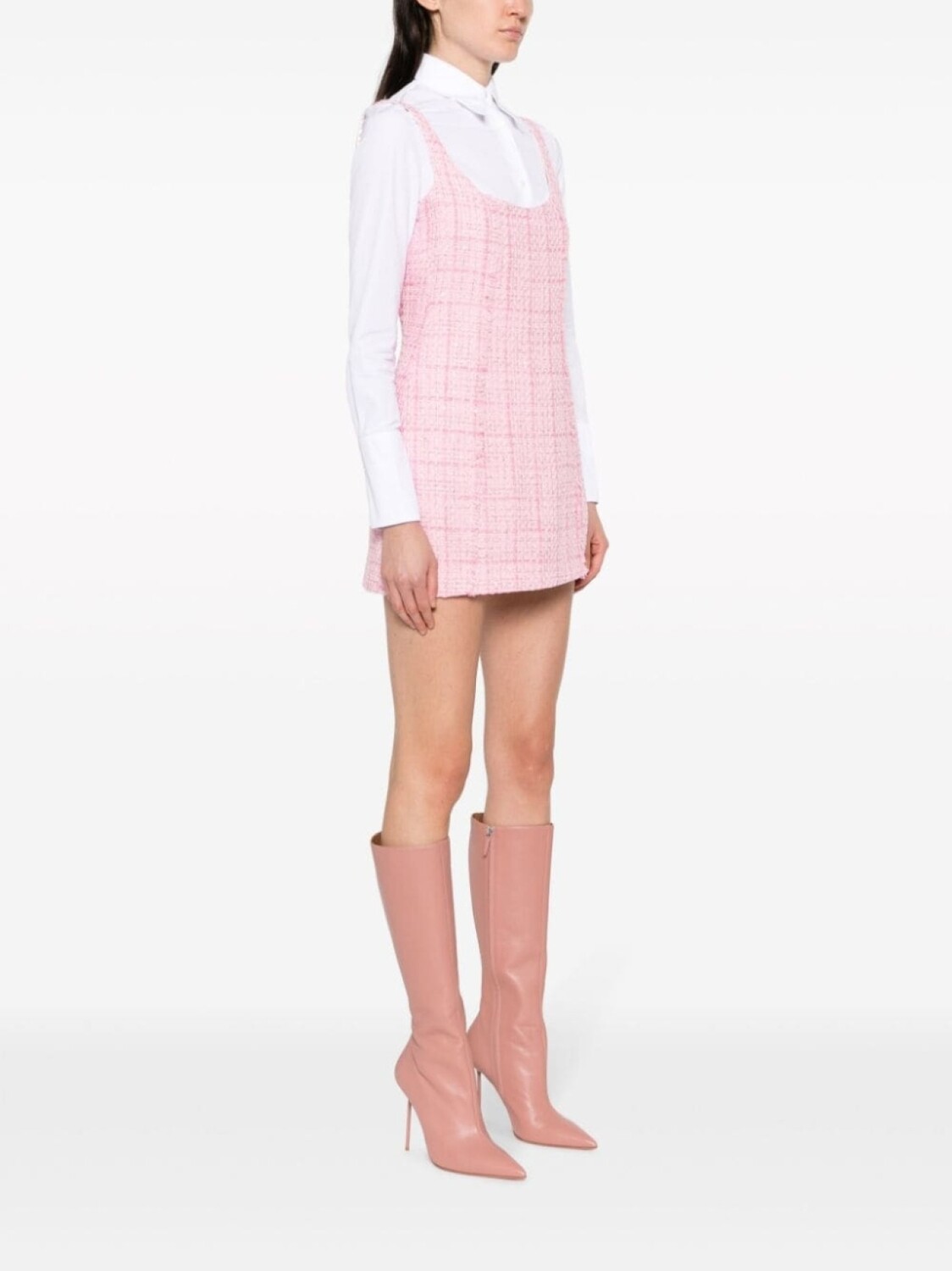 Светло-розовый, твидовая ткань, клетчатый узор, пайетки, без задника, круглый вырез, без рукавов, длина до бедер и прямой подол.