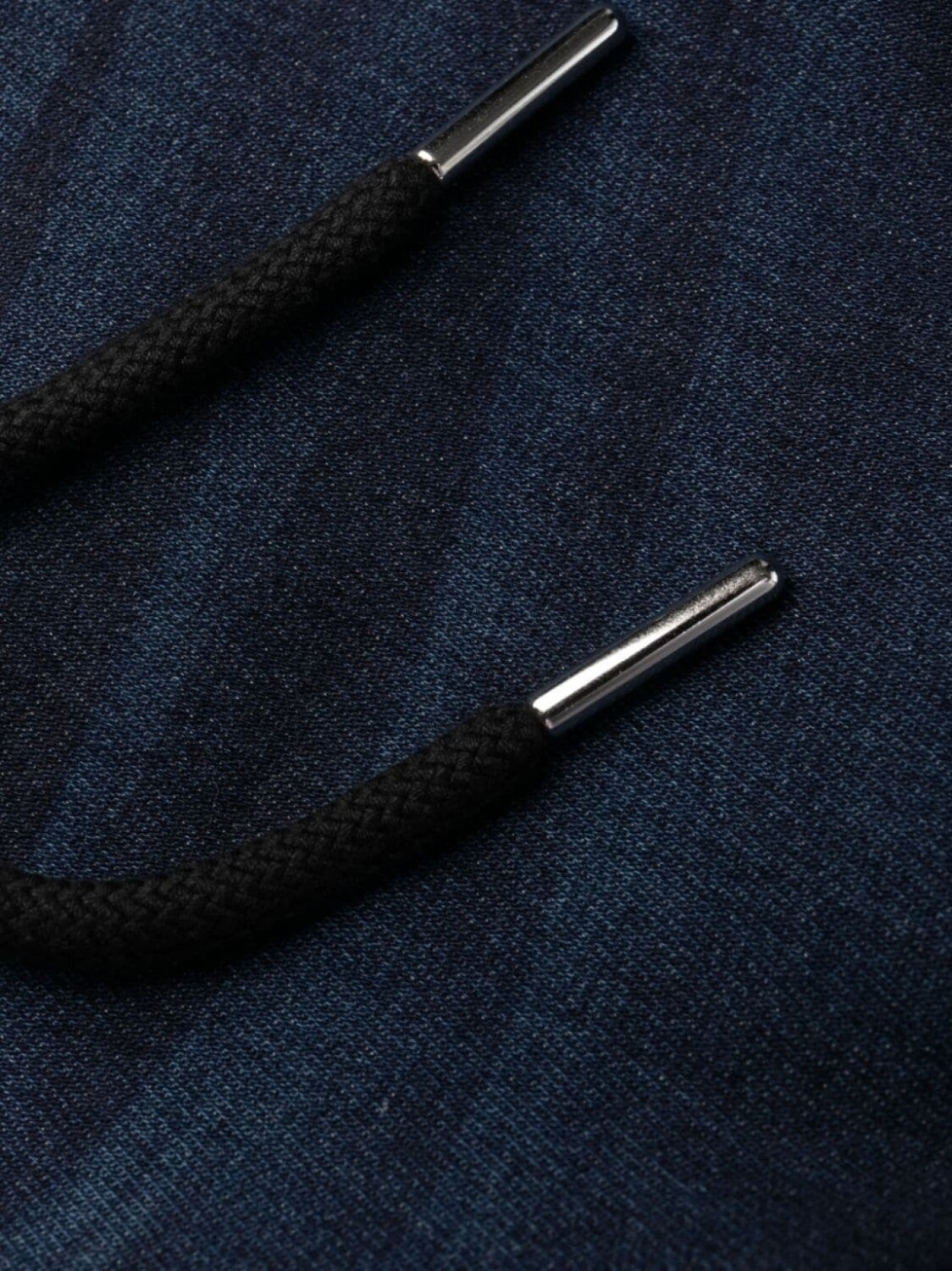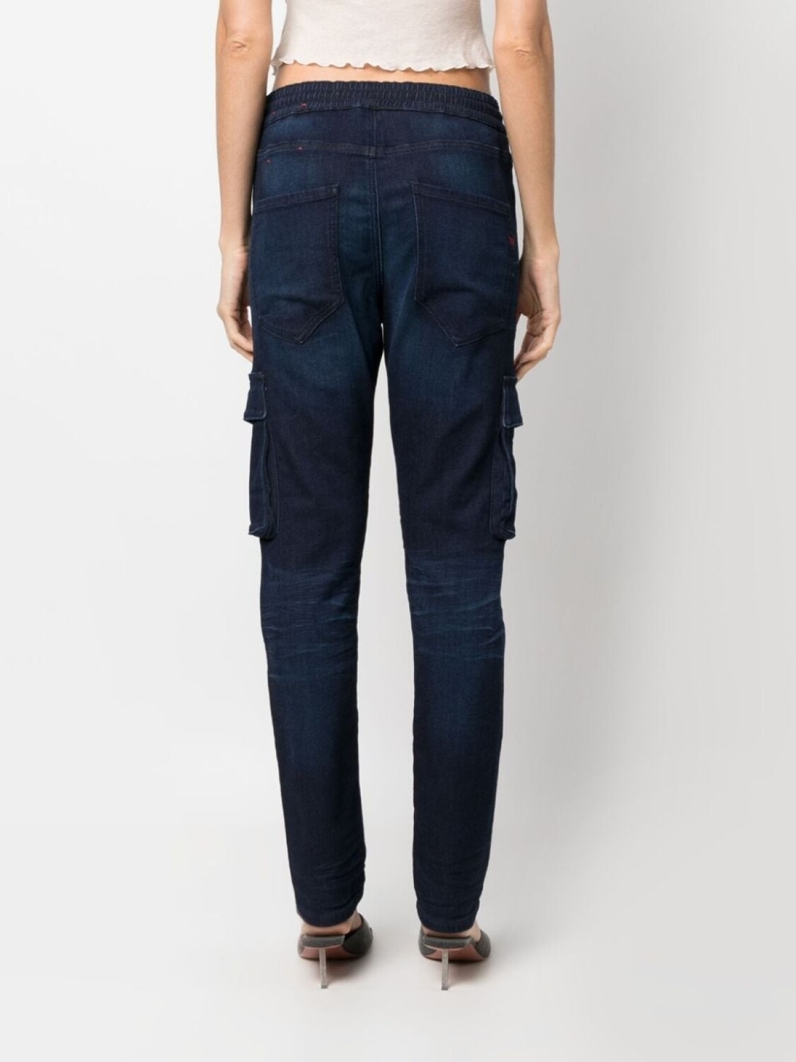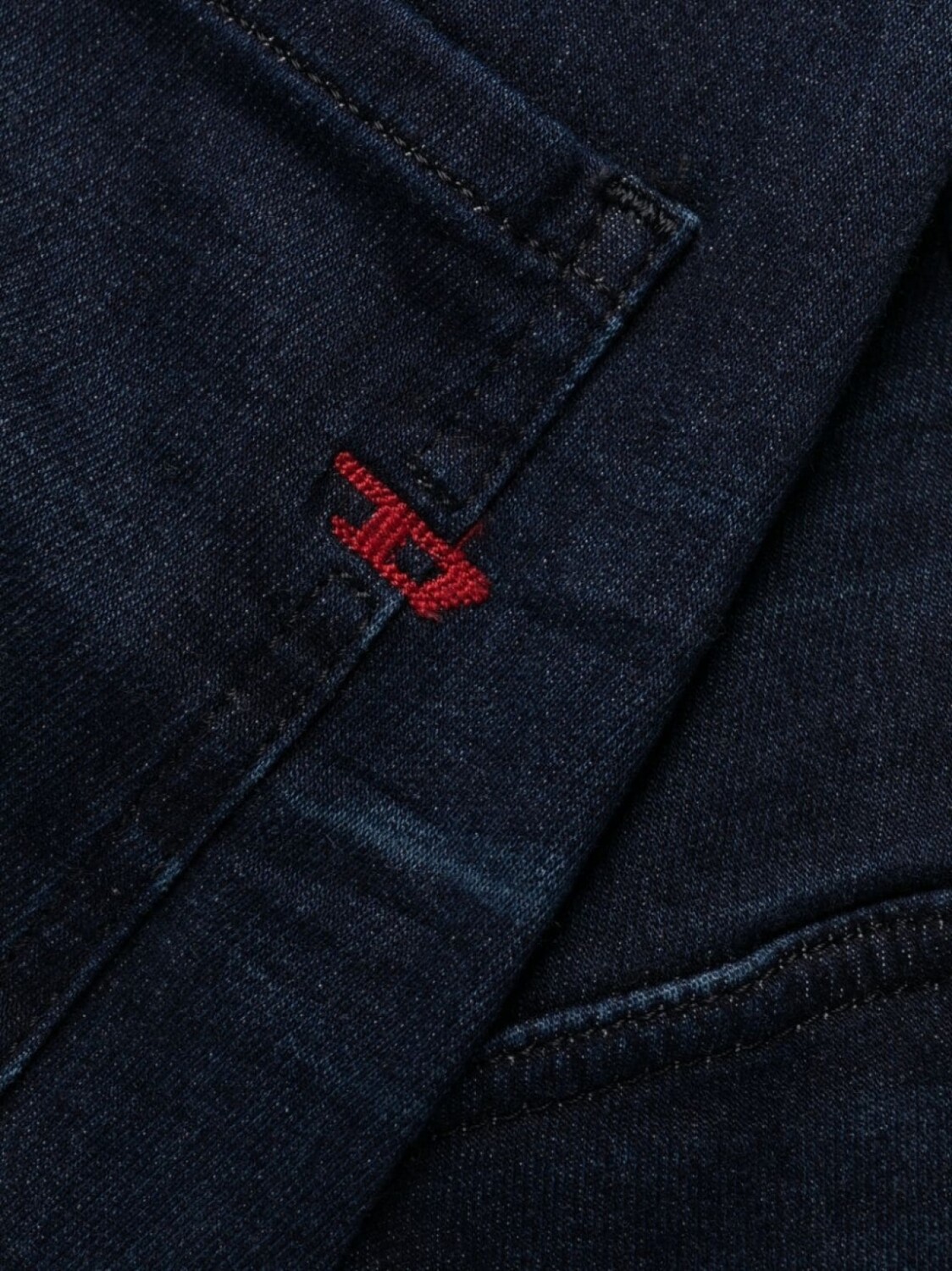 Синий, эластичный хлопок, обработанный деним, средняя посадка, узкий крой, нашивка с логотипом сбоку, нашивка с логотипом сзади, эластичный пояс на шнурке, два накладных кармана по бокам, классическая пятикарманная модель