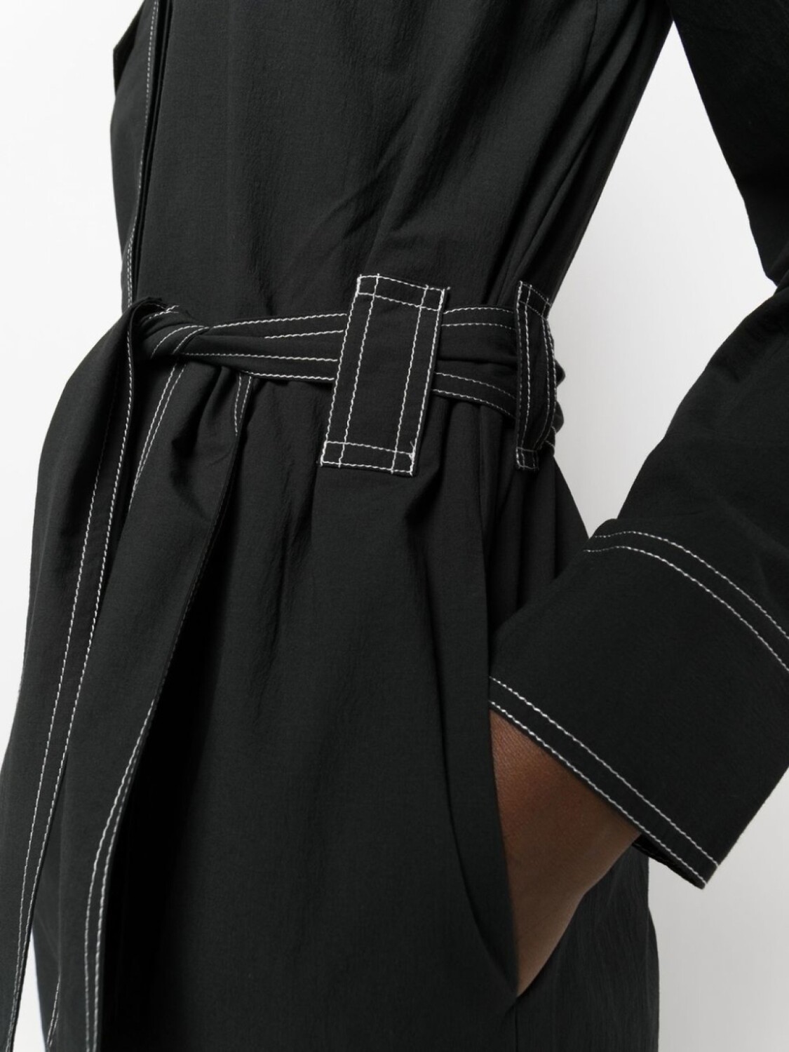 Черный/белый, смесовый органический хлопок, контрастная строчка, V-образный вырез, ремень на талии, потайная застежка спереди, длинные рукава, манжеты на пуговицах, два нагрудных кармана с клапанами, два вшитых кармана по бокам, два накладных кармана по бокам и длина макси. Ответственный выбор: