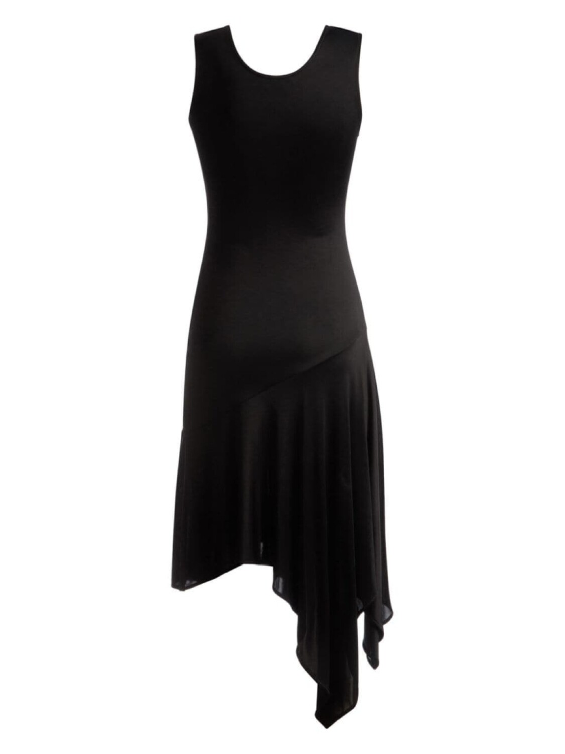 Черный, эластичный материал, золотистый металлический логотип, асимметричная форма, V-образный вырез, широкие бретели, без рукавов и подол с оборками.