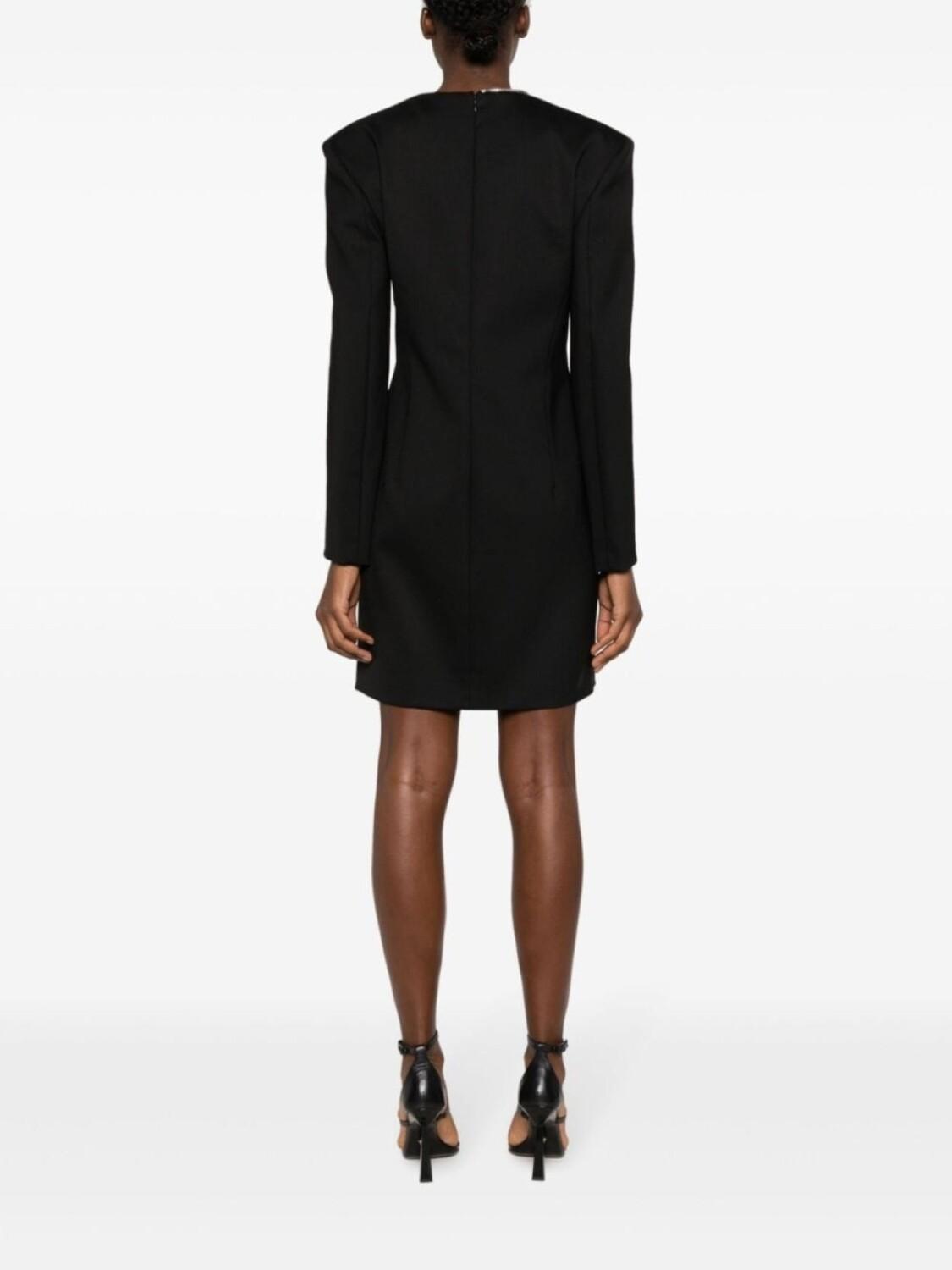 Черный, эластичный материал, отделка с декоративной молнией, V-образный вырез, длинные рукава, прямой подол и длина выше колена.