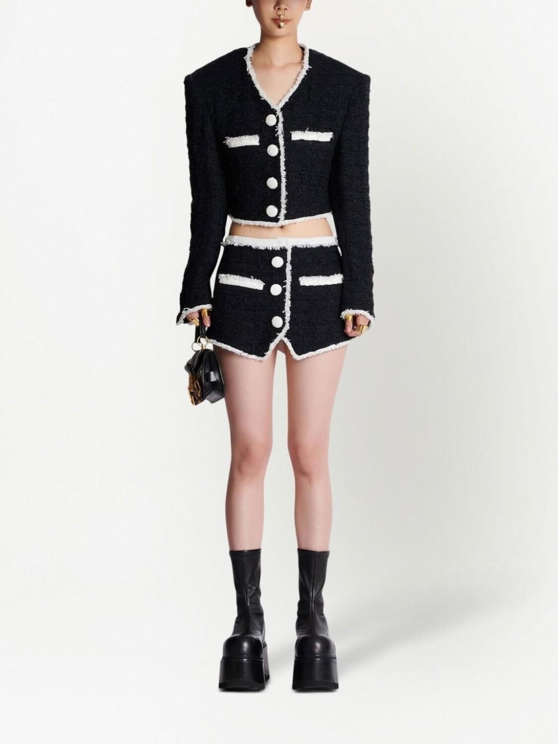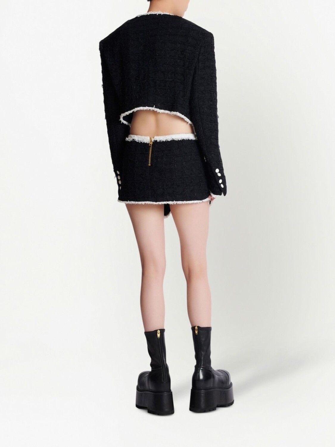 Black, tweed, low-rise, front button fastening, rear zip fastening, two front welt pockets, thigh-length