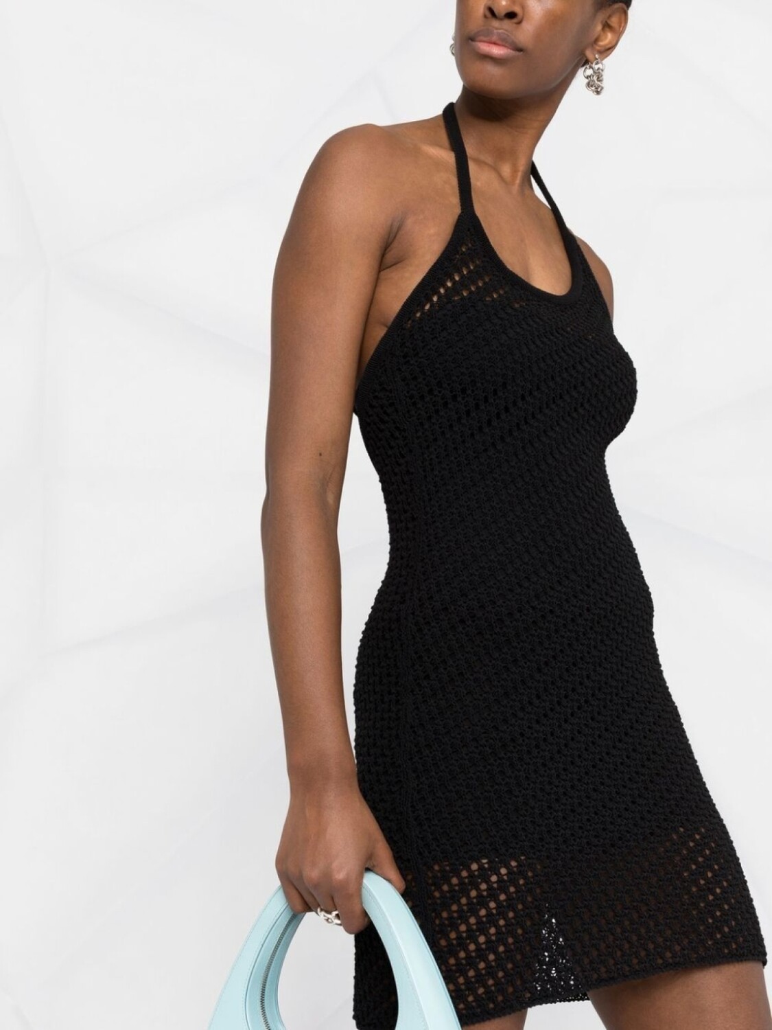 Модель в технике кроше, открытая спина, завязки вокруг шеи и без рукавов. Цвет: черный.