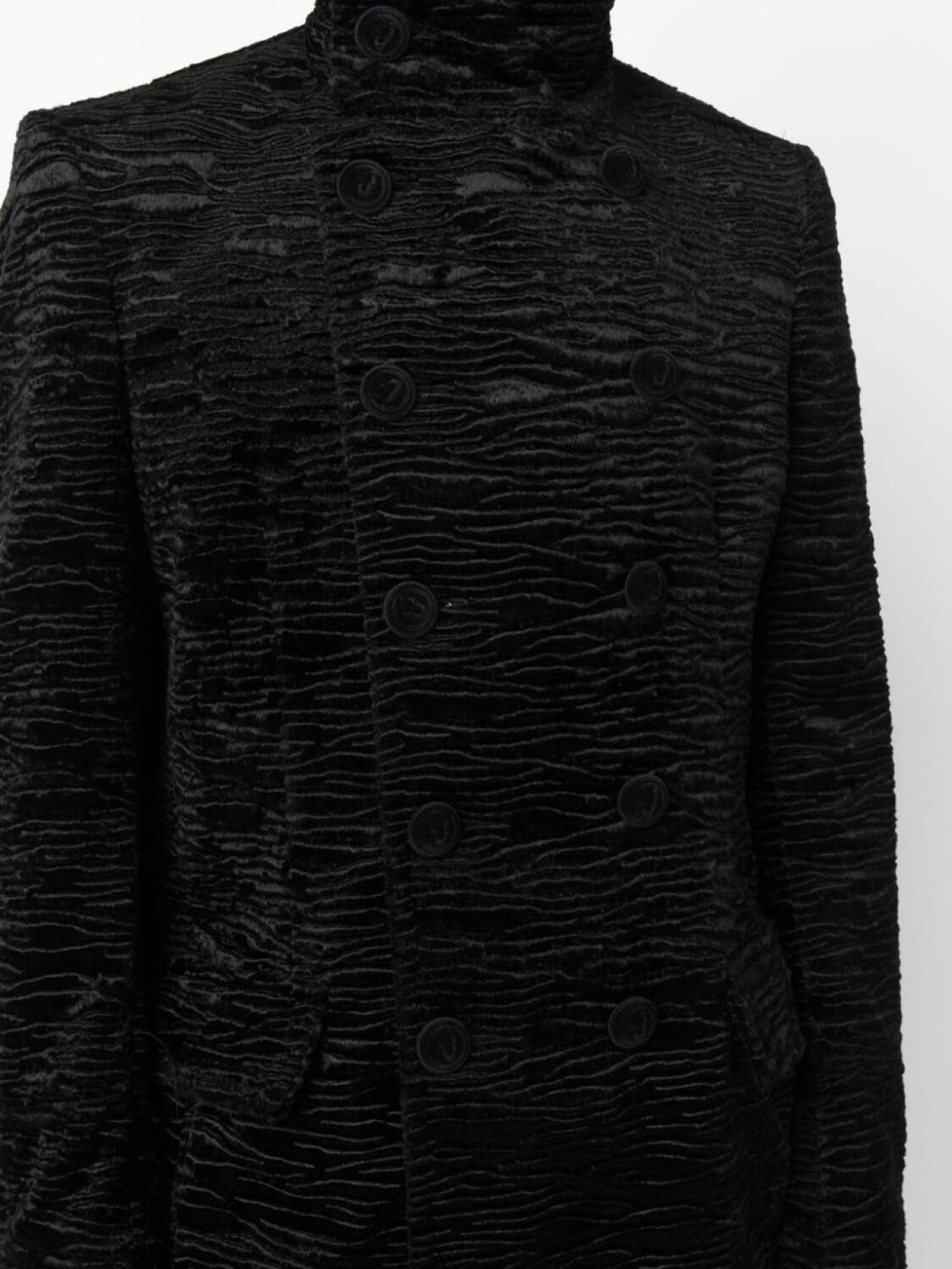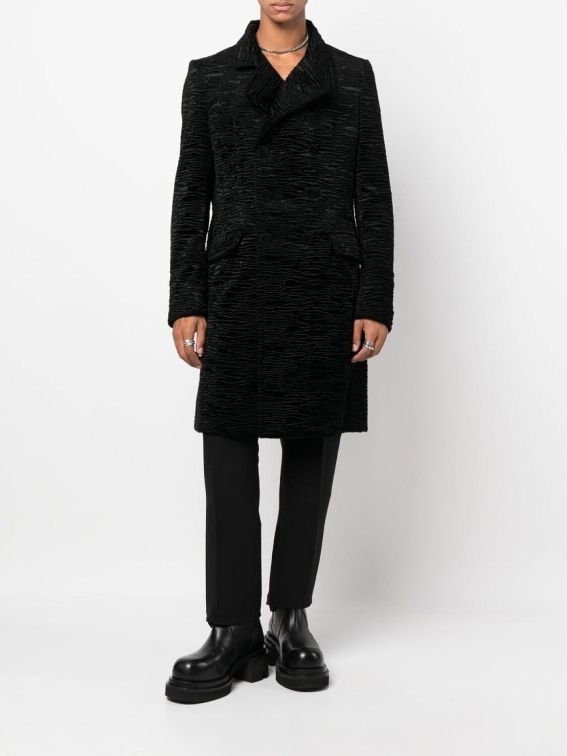 Черный, ткань с эффектом клоке, высокий воротник, двубортная застежка на кнопки, длинные рукава, два кармана с клапанами по бокам, шлица по центру сзади и длина миди.