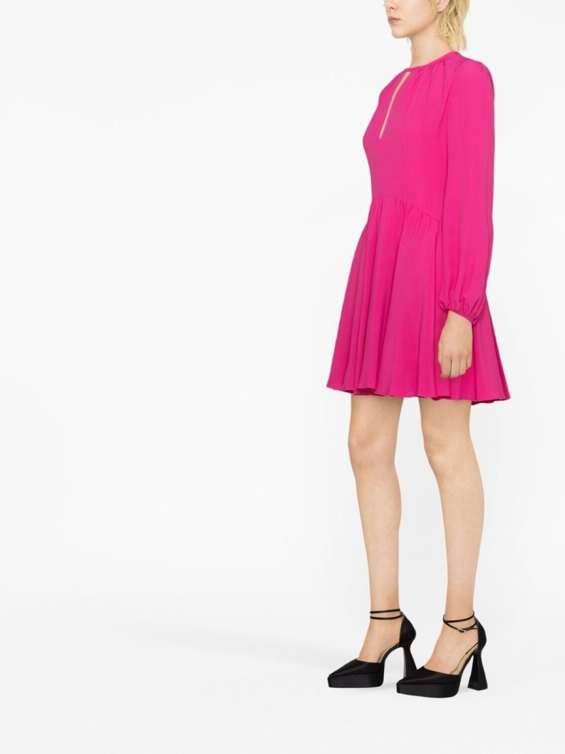 Розовый, смесовый шелк, вырез с прорезью, длинные рукава, манжеты на пуговицах, застежка на молнии сзади и шелковая подкладка.