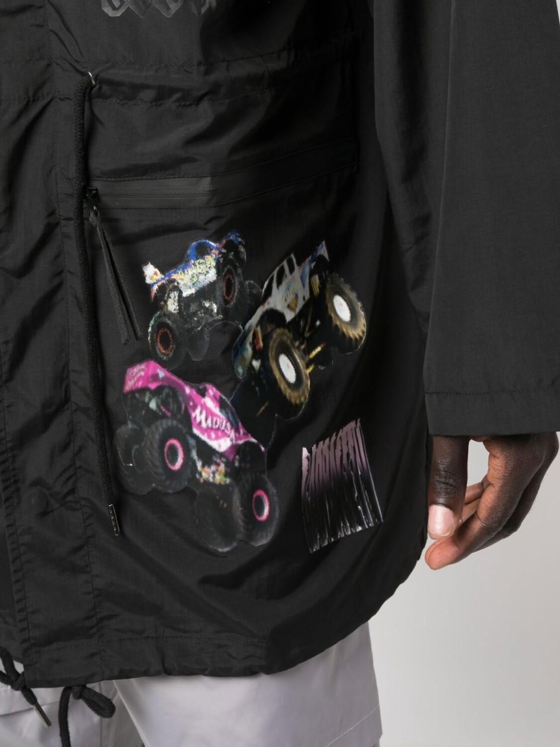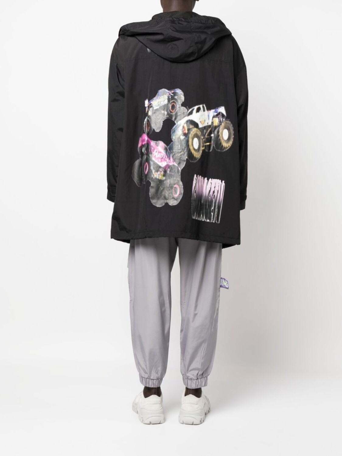 черный графичный принт спереди графичный принт на спине классический капюшон длинные рукава застежка на молнии спереди длина выше колена