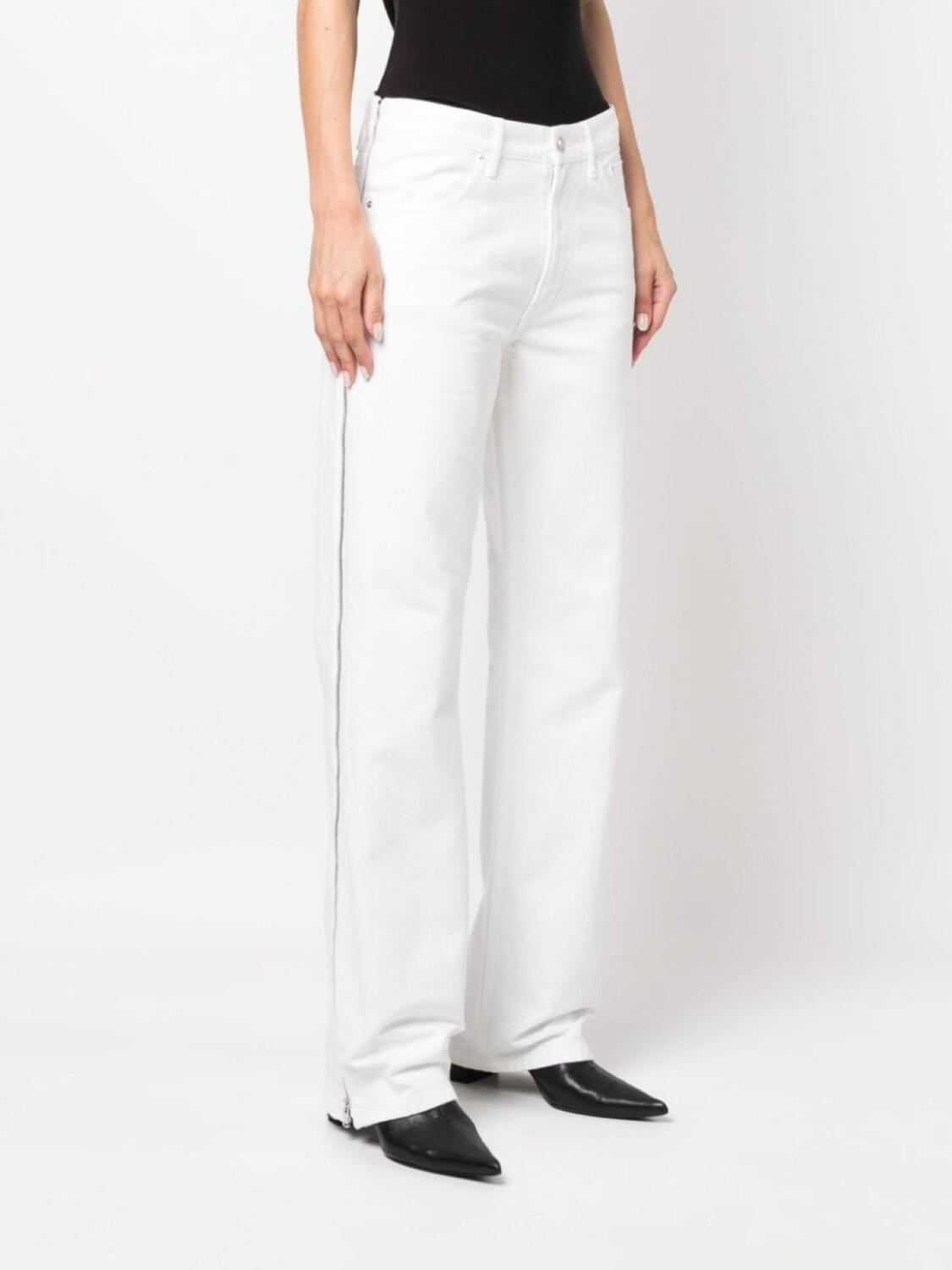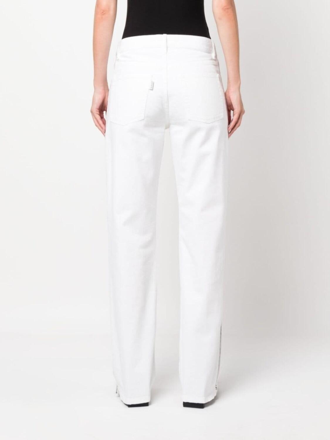Белый, строчка в тон, серебристая фурнитура, петли для ремня, ширинка на пуговицах, застежка на молнии сбоку, низкая посадка, прямой крой, пять карманов и прямой подол.