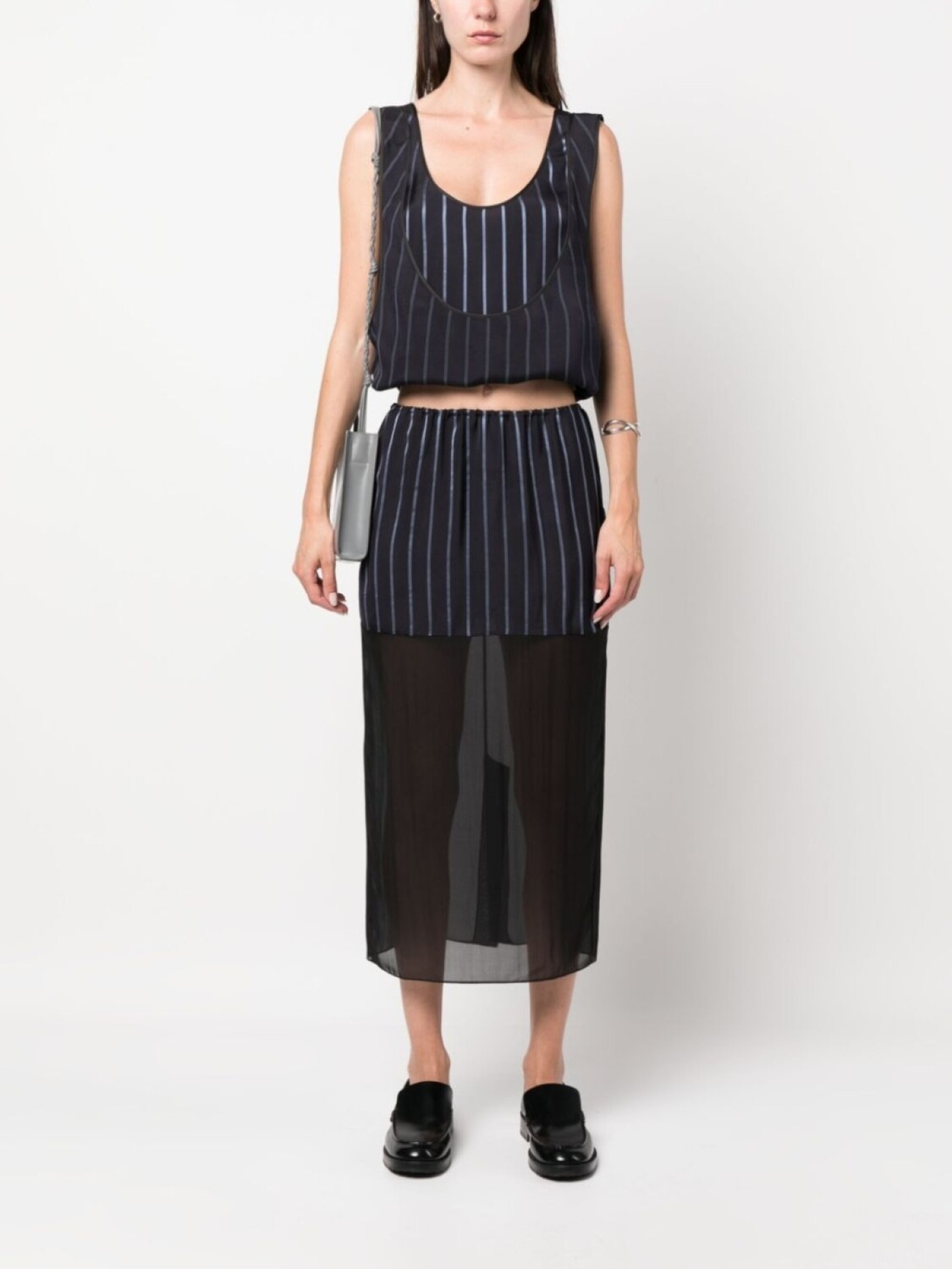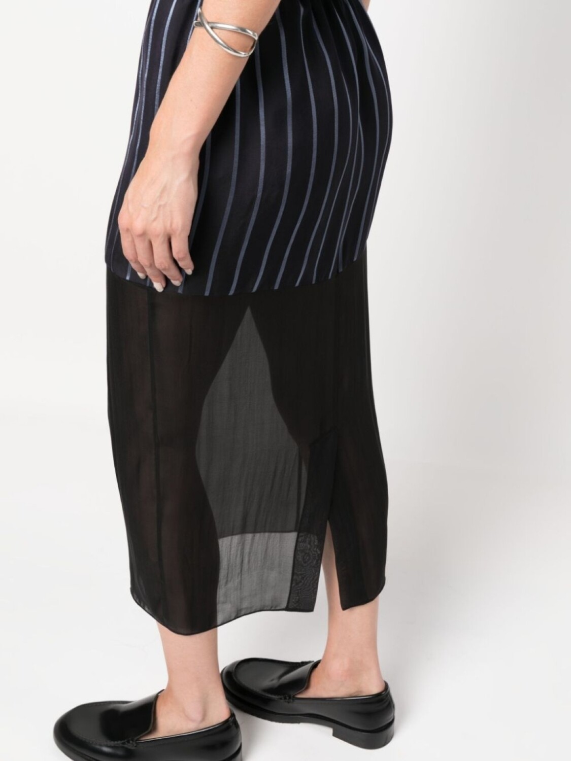 Темно-синий, черный, полупрозрачный дизайн, узор в вертикальную полоску, завышенная линия талии, вырез сзади, прямой подол и длина миди.