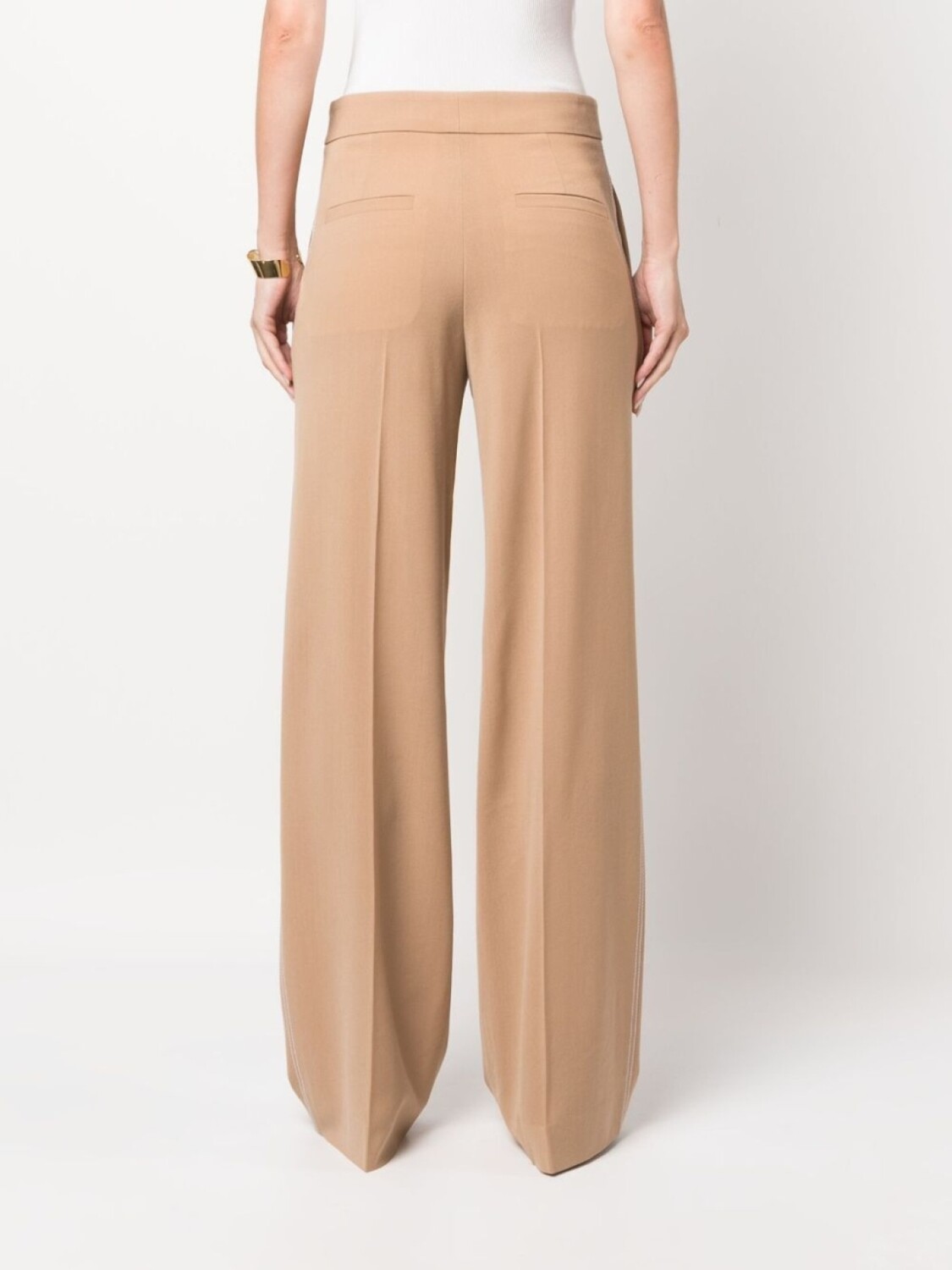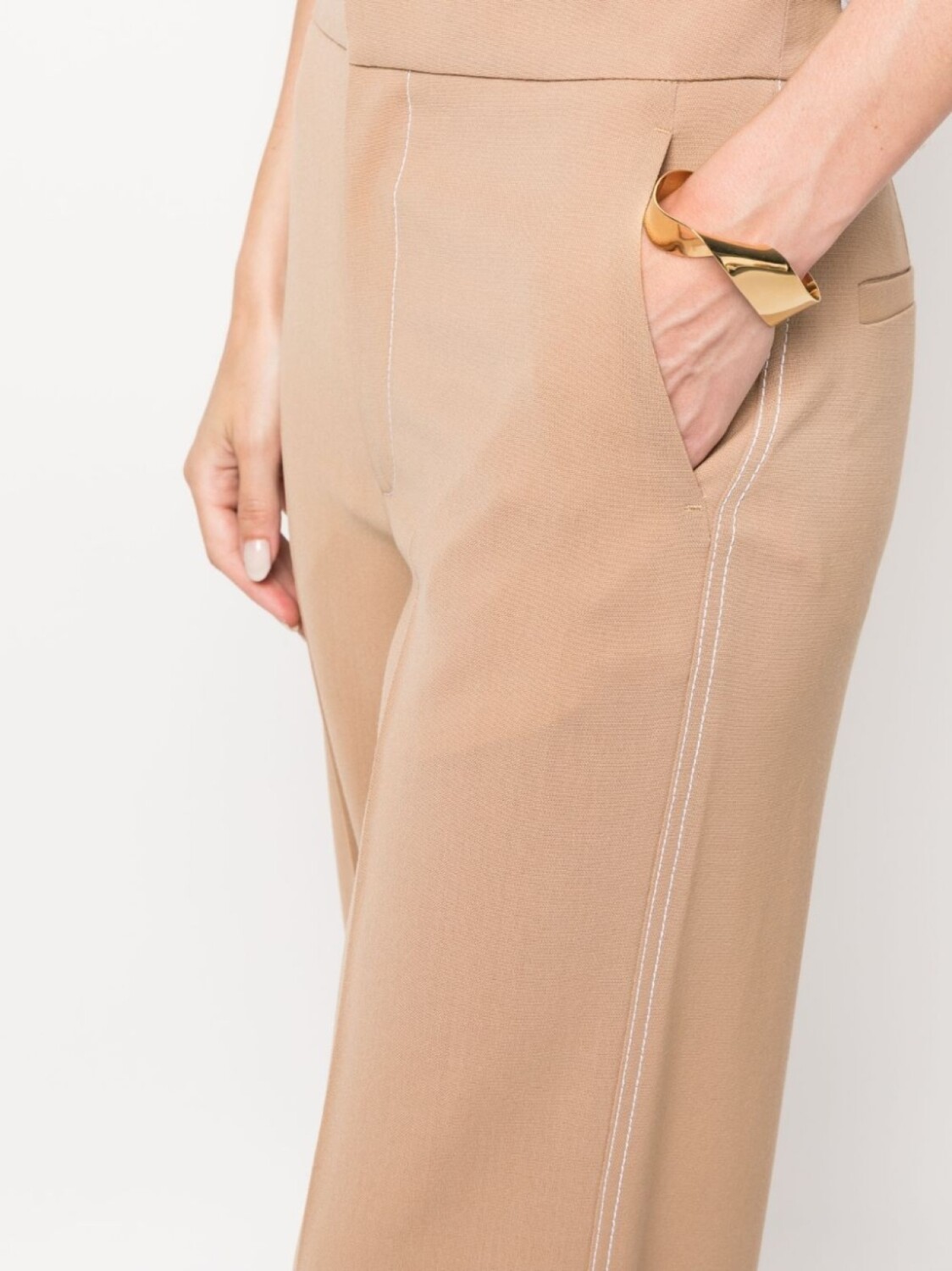 Бежево-коричневый, смесовая необработанная шерсть, контрастная строчка, стрелки, потайная застежка спереди, средняя посадка, прямой крой, два кармана по бокам, два кармана с листочкой сзади и прямой подол.