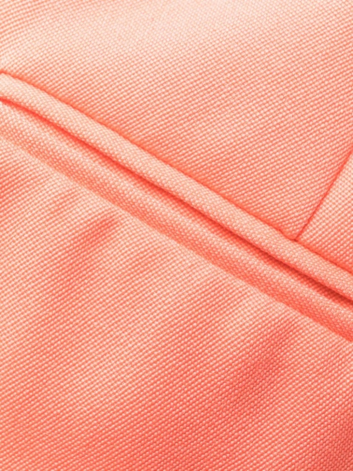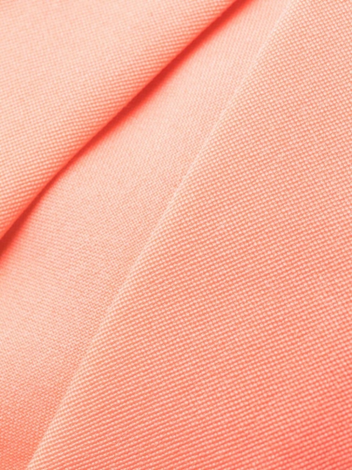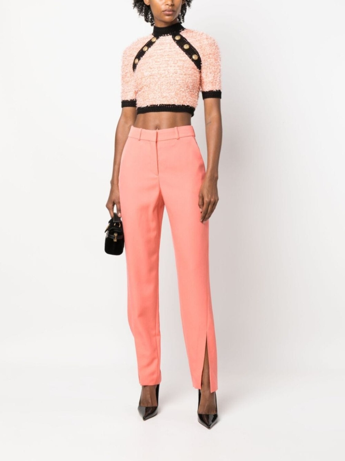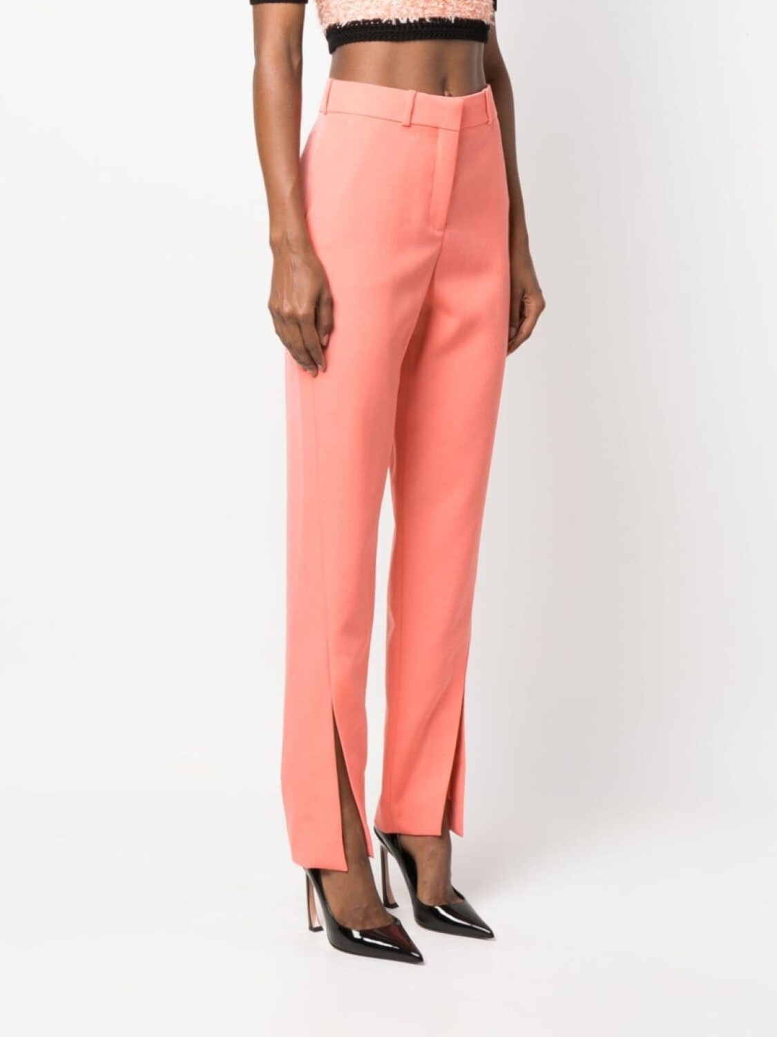 Персиково-оранжевый, необработанная шерсть, петли для ремня, потайная застежка спереди, завышенная линия талии, зауженный крой, два вшитых кармана по бокам, два прорезных кармана сзади и манжеты с разрезами.