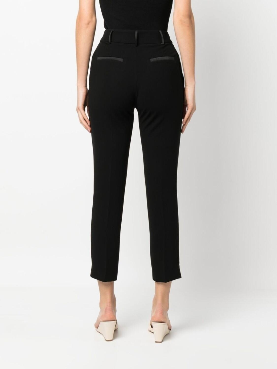 Черный, ткань джерси «скуба», петли для ремня, укороченная длина, потайная застежка спереди, карман на пуговице и два кармана с листочкой сзади.