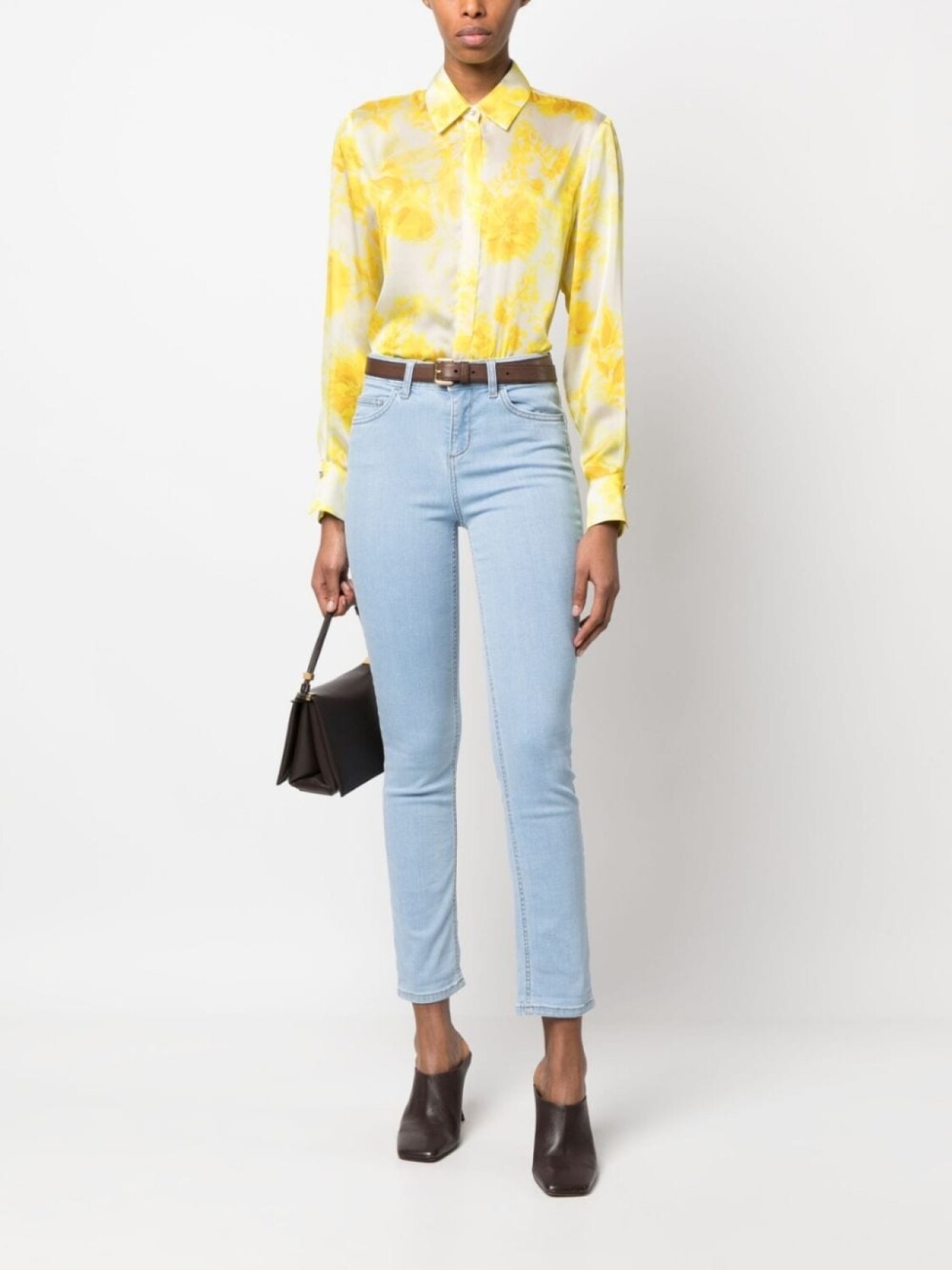 Голубой, эластичный хлопок, петли для ремня, средняя посадка, облегающий крой, застежка на пуговицах спереди, пять карманов и укороченная длина.