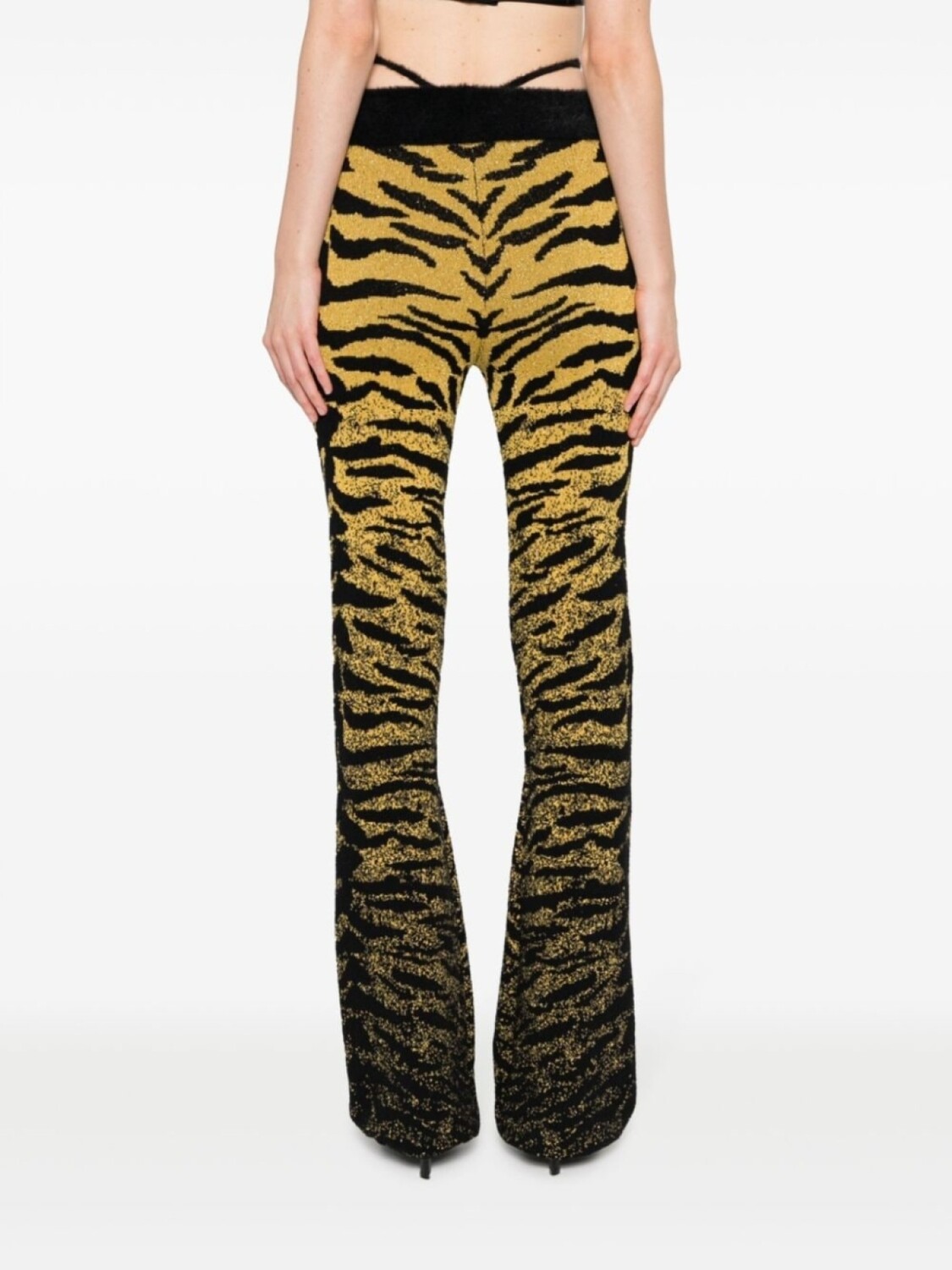 Черный, ярко-желтый, эластичный хлопок, люрекс, зебровый принт, жаккардовый материал с узором, золотистый металлический логотип, отделка из искусственного меха, расклешенный крой, эластичный пояс и прямой подол.