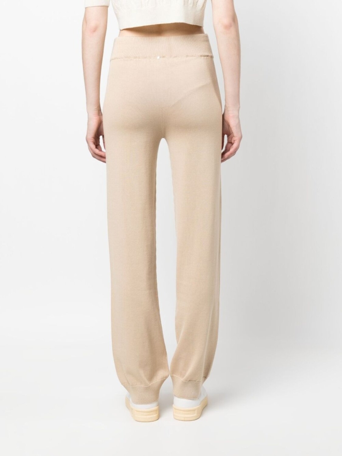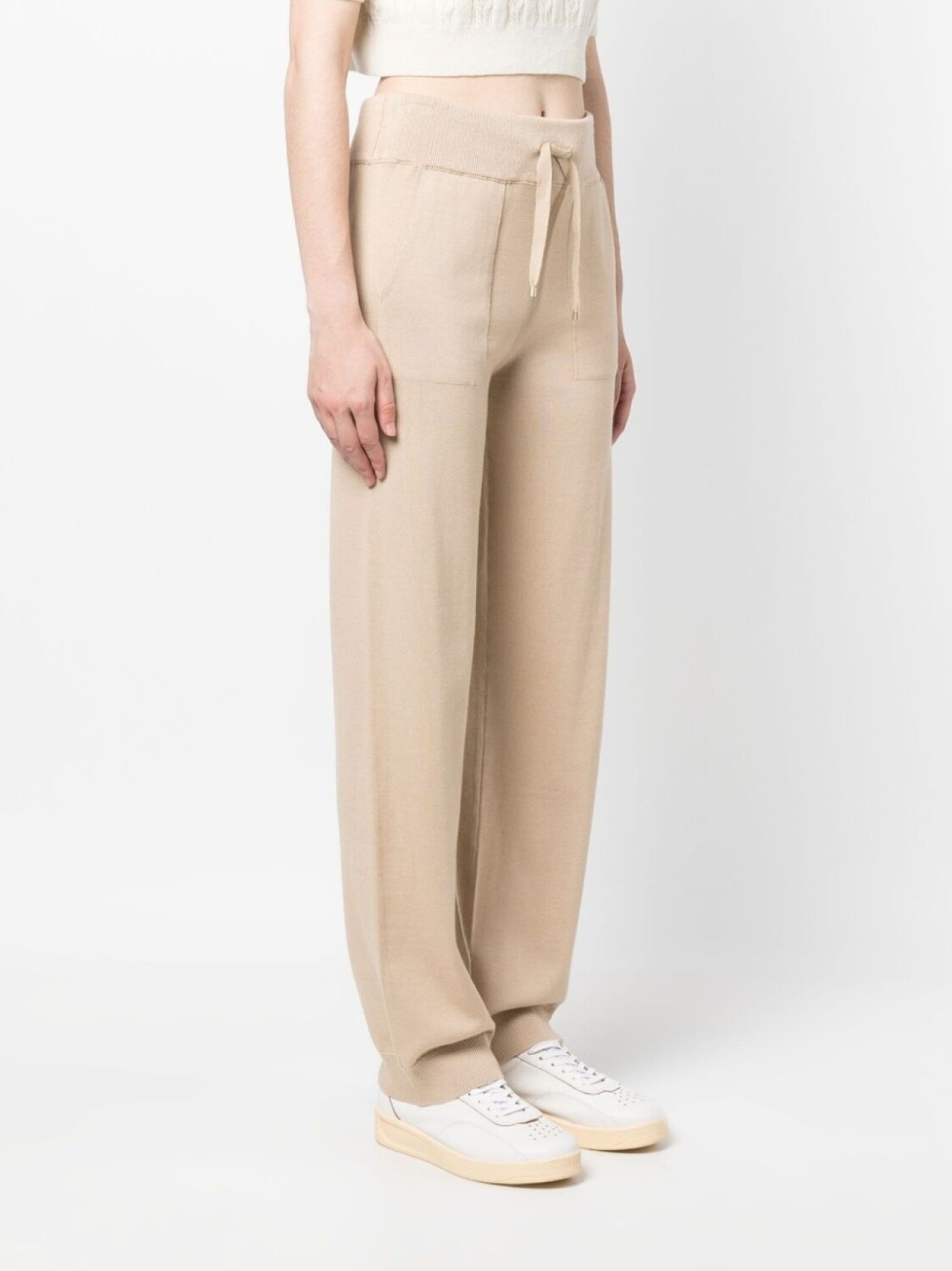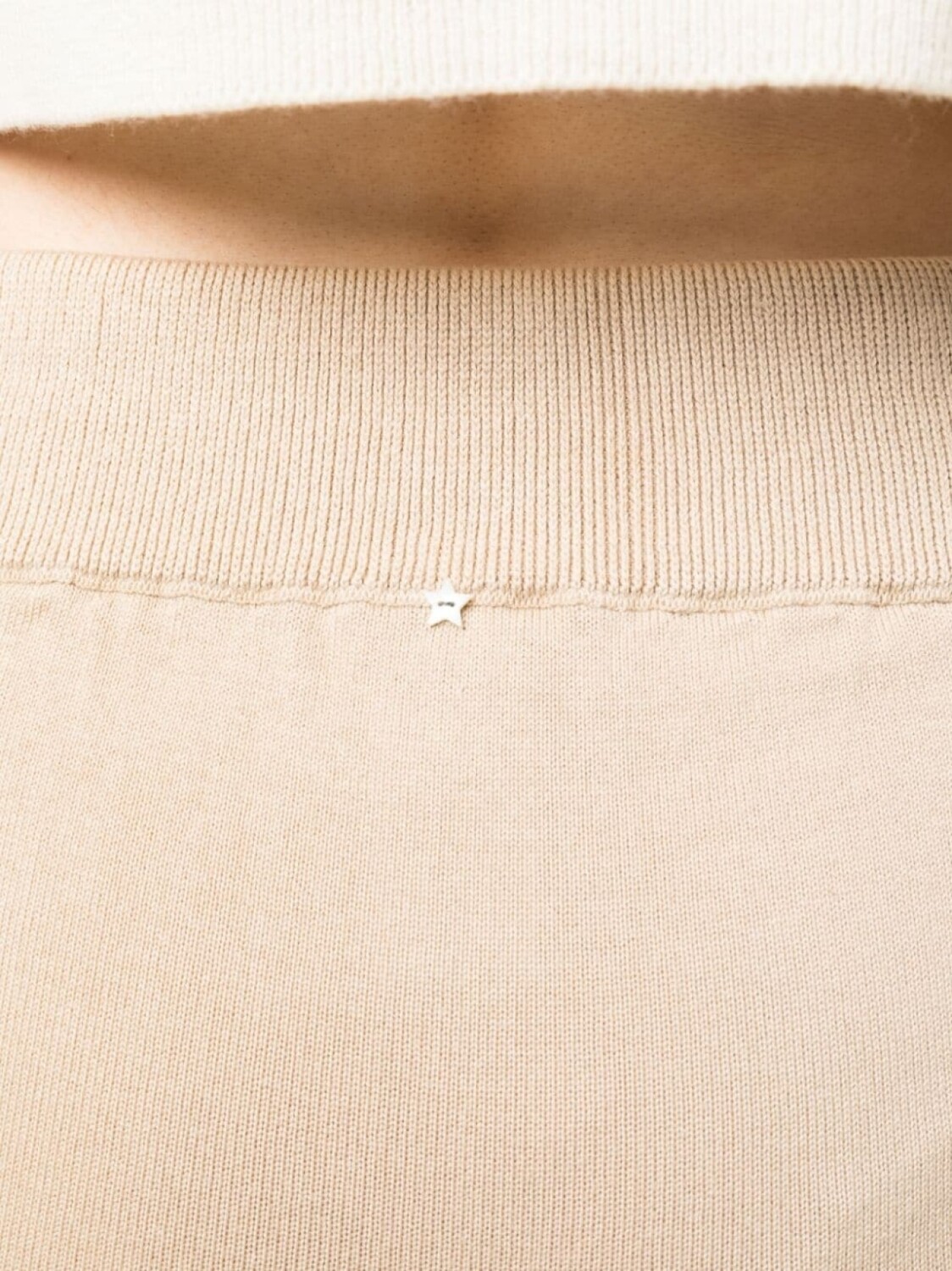 Бежевый, смесь хлопка и кашемира, тонкая вязка, кулиска на талии, прямой крой и два прорезных кармана по бокам.