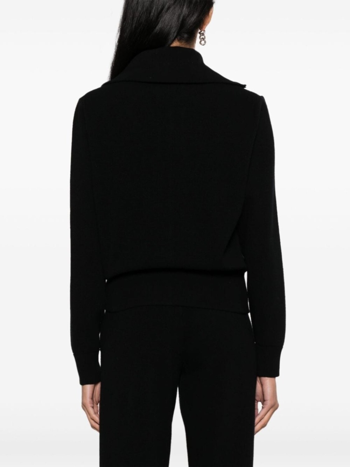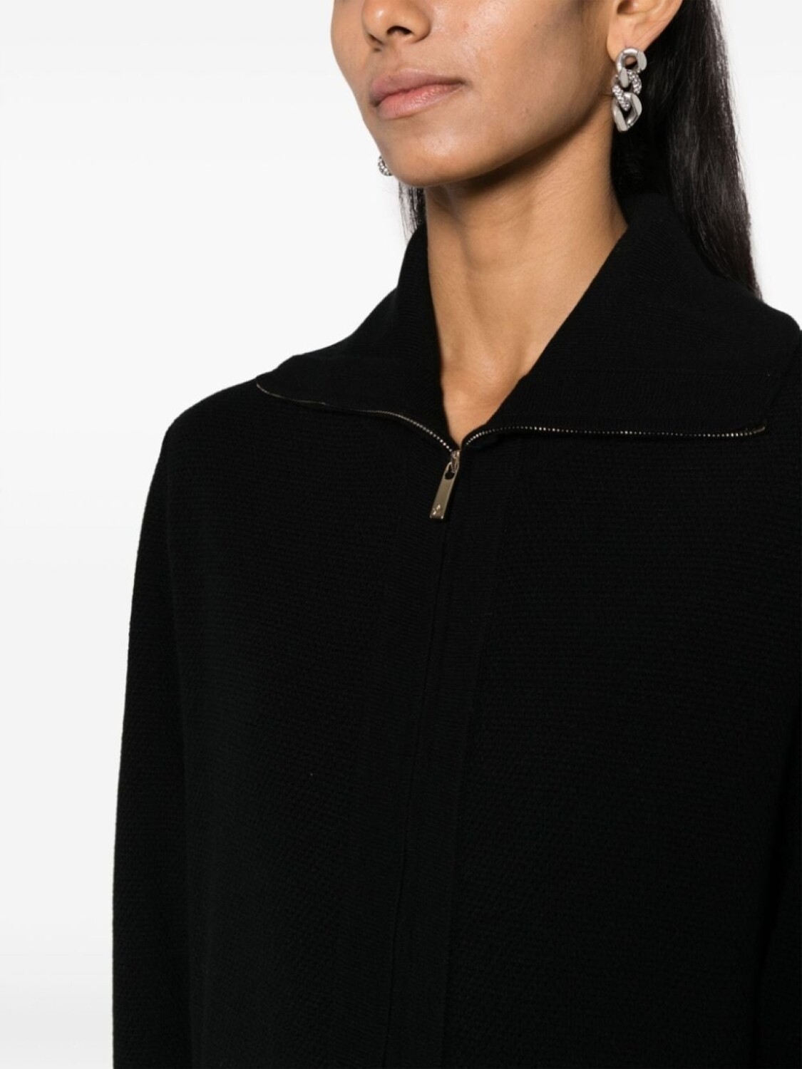 Черный, смесовая необработанная шерсть, трикотажный материал, высокий воротник, потайная молния спереди, отложной воротник и длинные рукава.