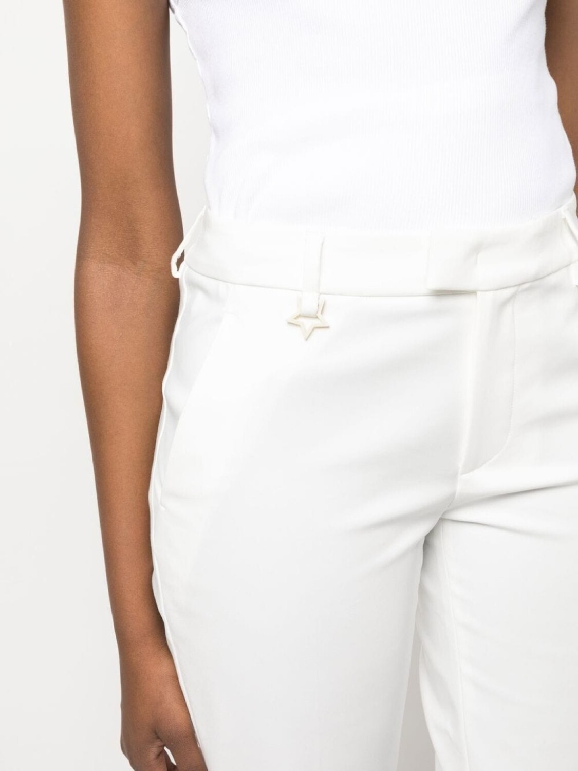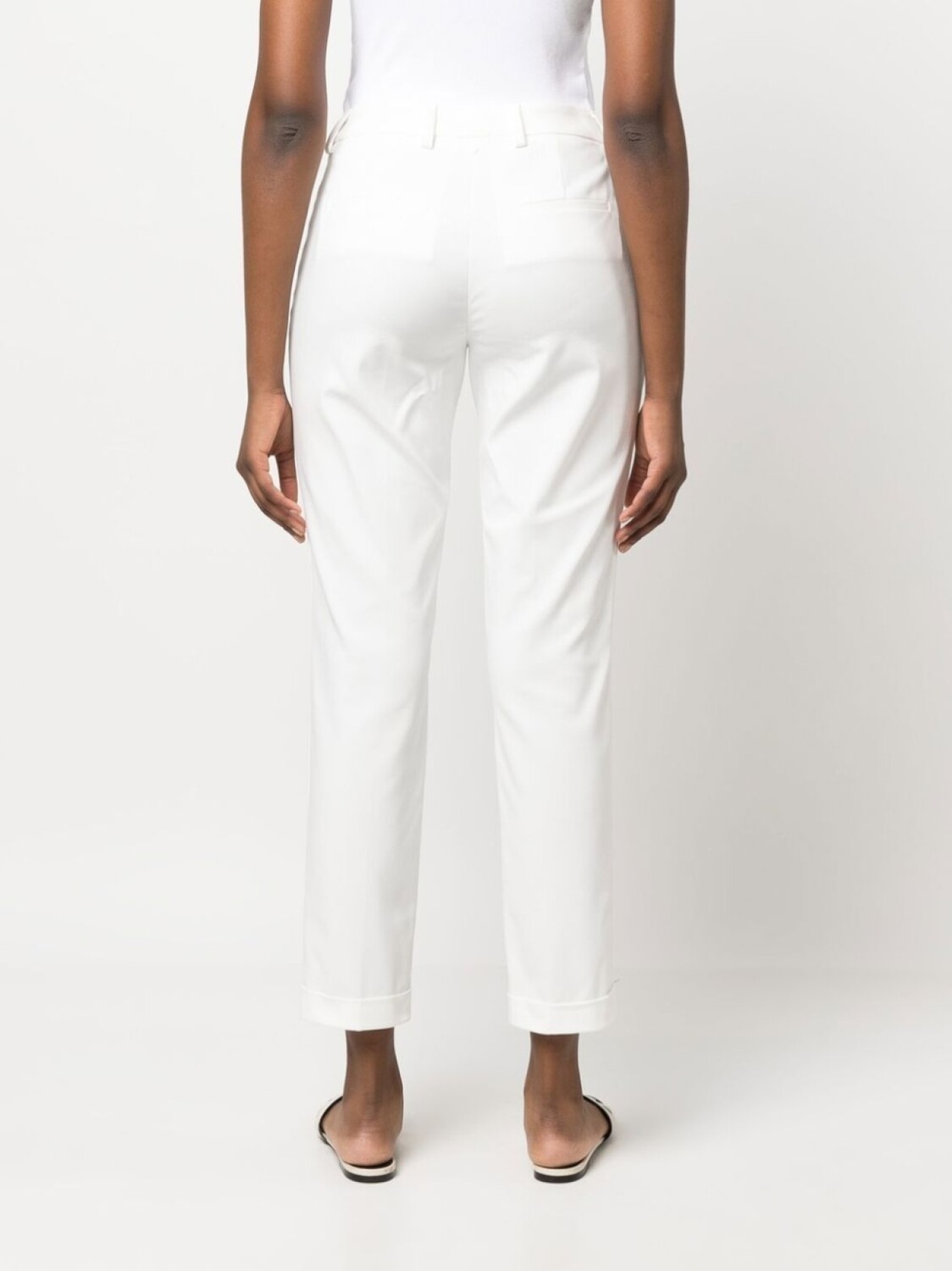 Белый, смесовый хлопок, подвеска с логотипом, укороченная длина, средняя посадка, петли для ремня, потайная молния спереди, два прорезных кармана по бокам, два кармана с листочкой сзади и подвороты.