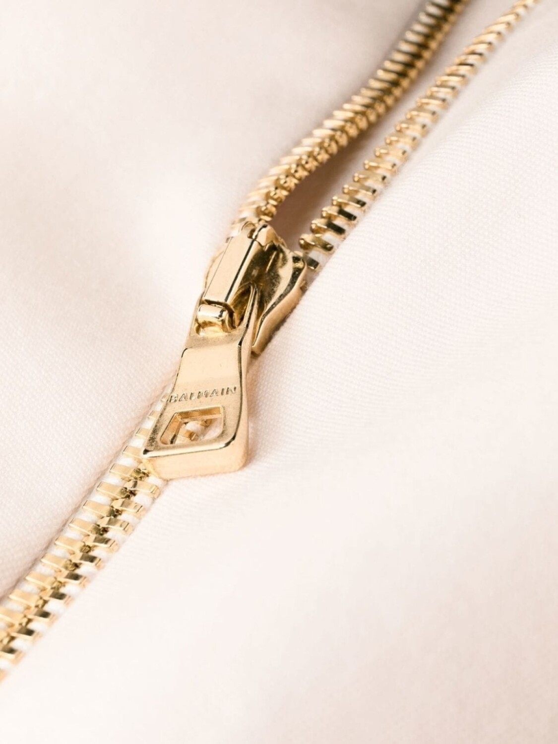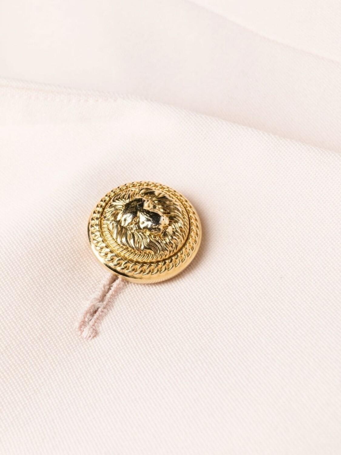 Расцветка Poudre Pink, шерсть, широкие заостренные лацканы, золотистые пуговицы с тиснением, застежка на пуговицах спереди, длинные рукава, два прорезных кармана сбоку и застежка на молнии сзади.