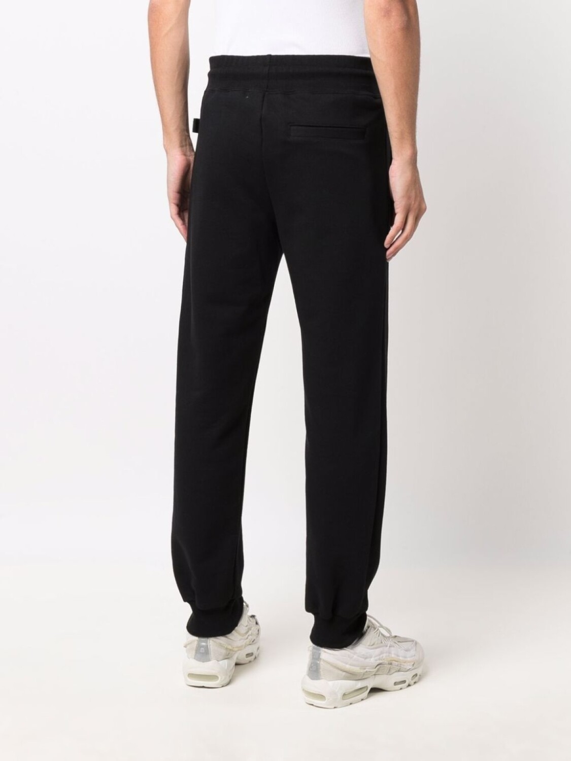 Черный, хлопок, логотип сбоку, полоска сбоку, эластичный пояс на шнурке, два вшитых кармана по бокам, два кармана с листочкой сзади и эластичные манжеты.