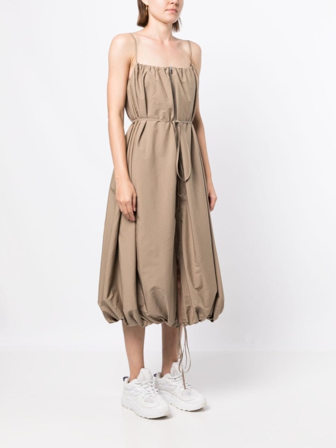 Бежевый, расклешенный крой, квадратный вырез, застежка на молнии спереди, тонкие бретели, кулиска на талии и длина миди.