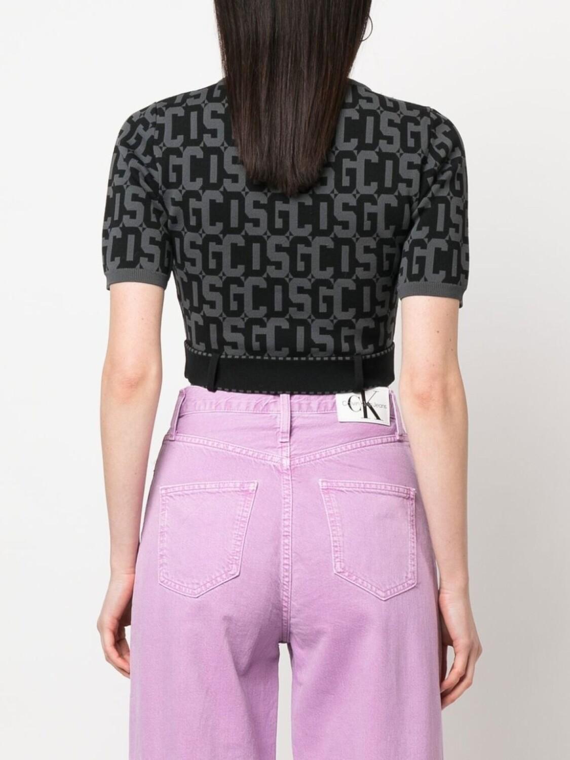 Черный/серый, трикотажный материал, вязка в технике интарсия, узор с изображением монограммы, круглый вырез, короткие рукава, манжеты в рубчик, подол в рубчик и укороченная длина.
