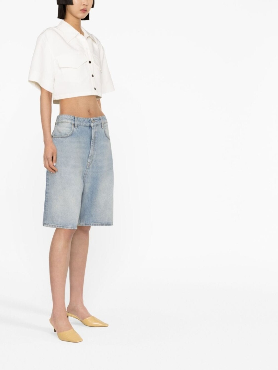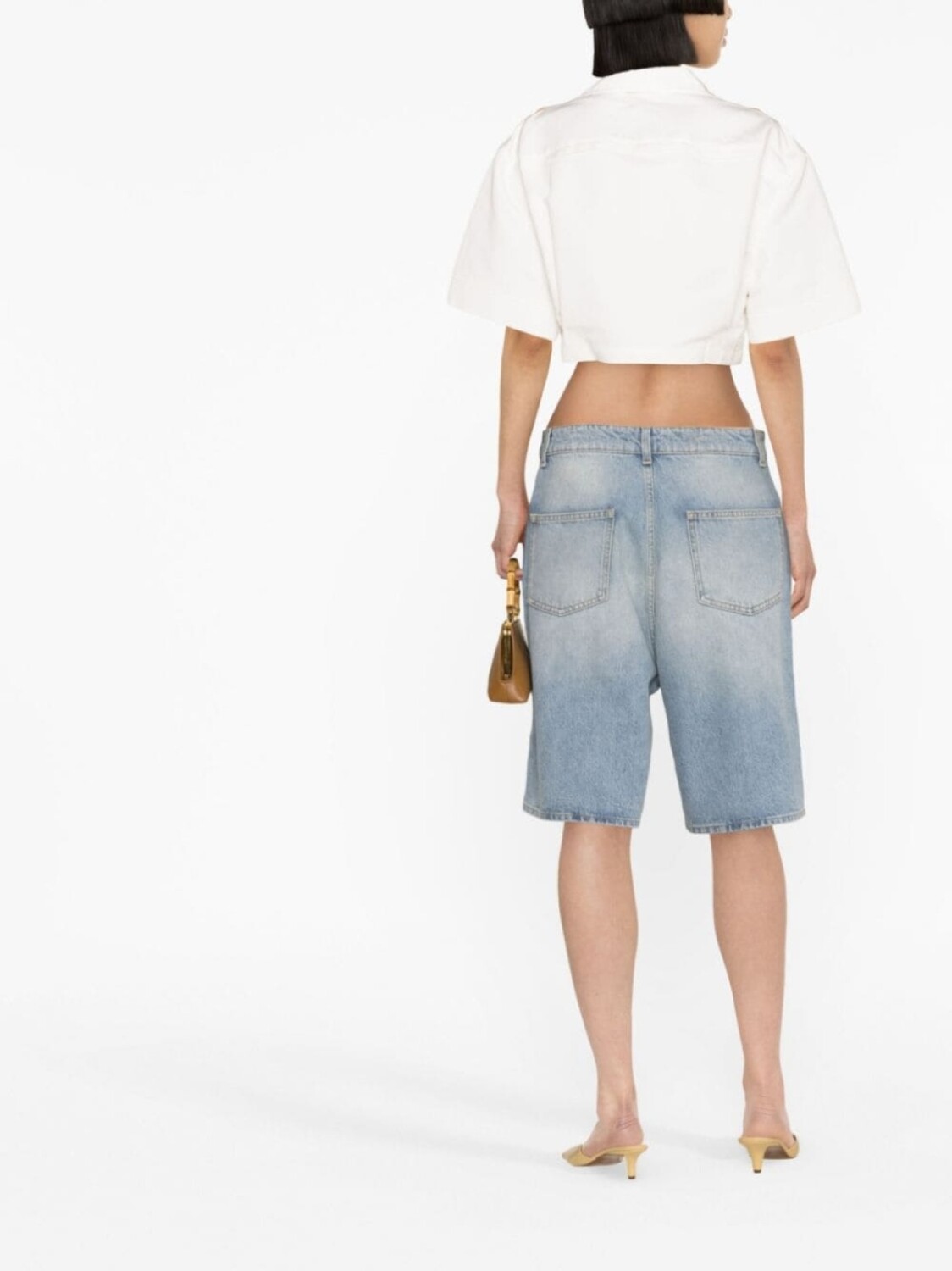 Голубой, органический хлопок, обработанный деним, два прорезных кармана по бокам, два накладных кармана сзади, застежка на молнии и пуговице спереди, петли для ремня, низкая посадка и длина по колено. Этот товар как минимум на 50% состоит из органических материалов. Узнать больше о том, какие товары получают отметку «Ответственный выбор», можно здесь.